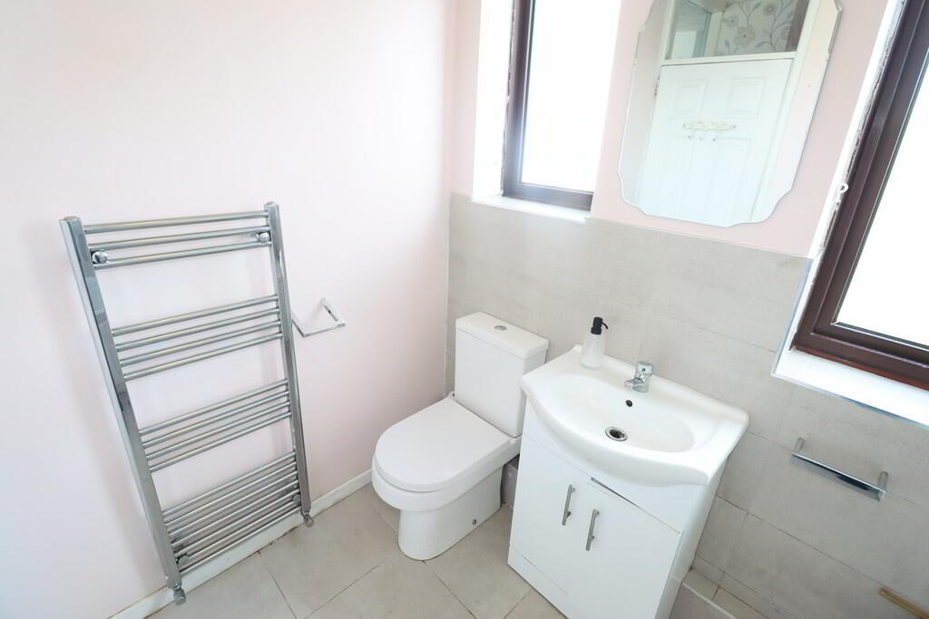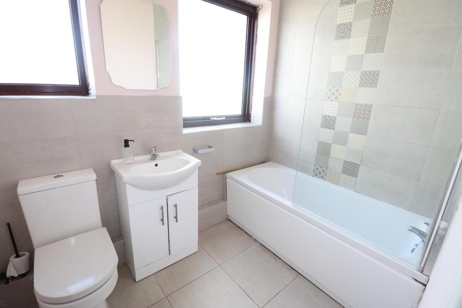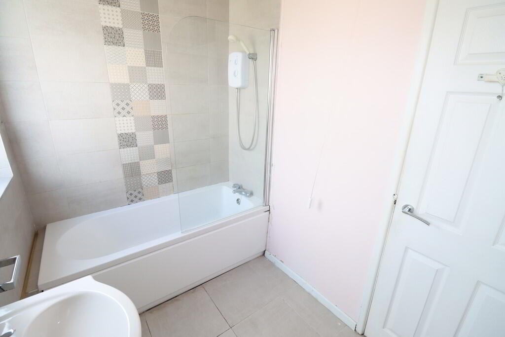BATHROOM uPVC bath unit, electric shower, glazed shower screen, wall panelling, vanity sink unit, low flush W/C, ceramic tiled flooring, extractor fan, chrome heated towel rail