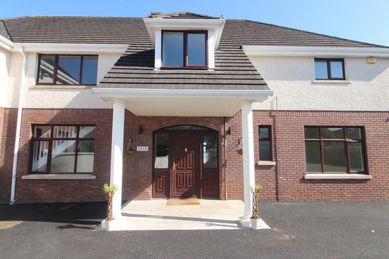 OUTSIDE Front in extensive driveway, lawn with entrance post