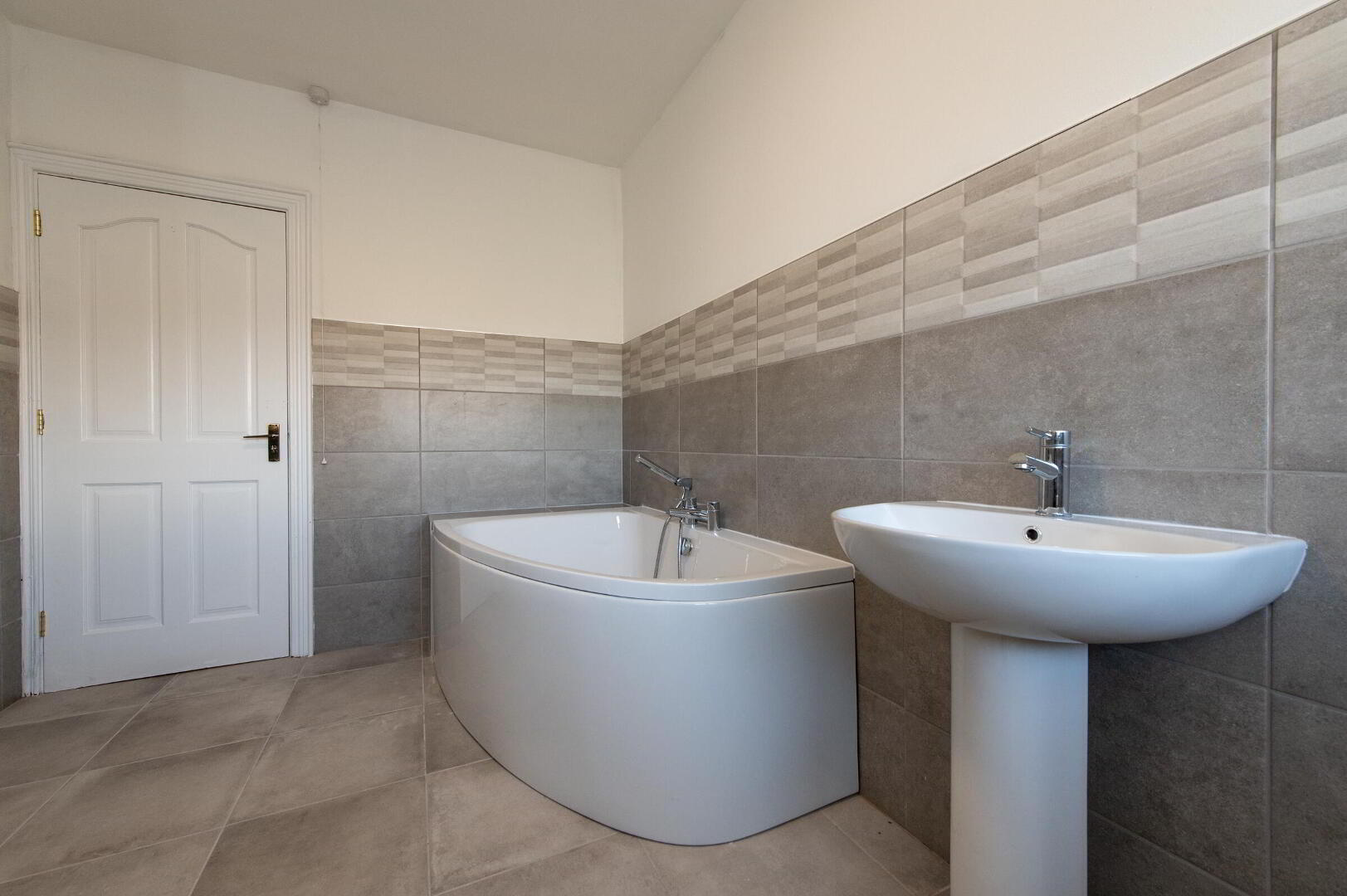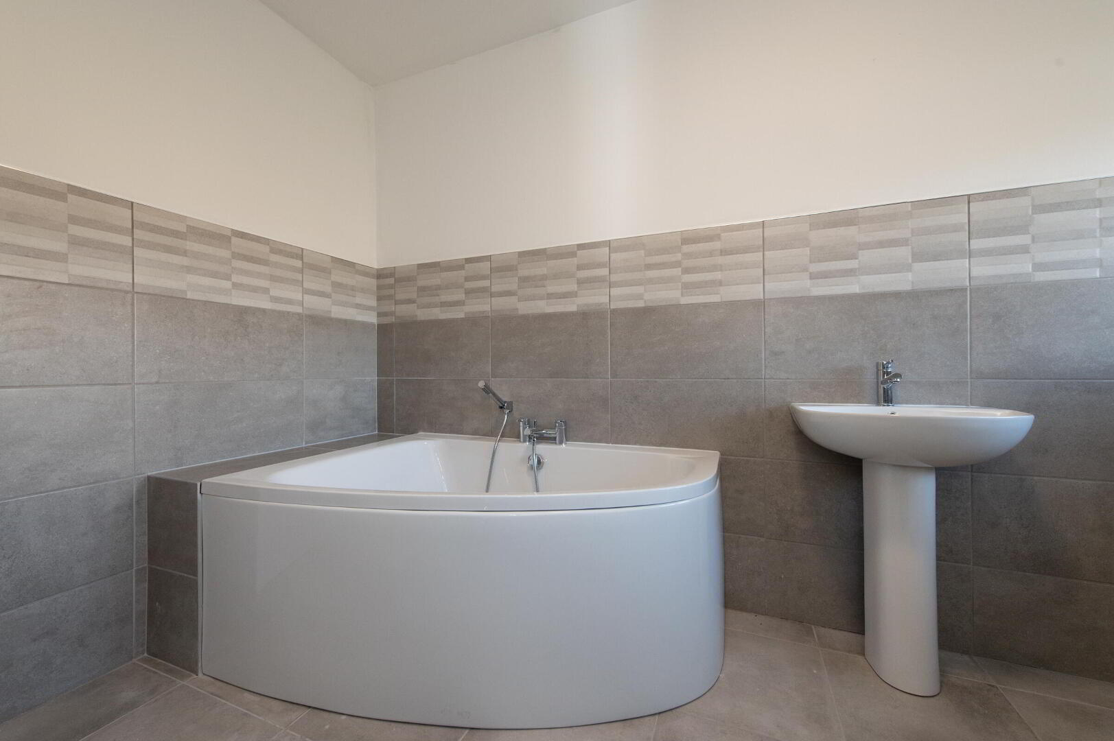 BATHROOM Luxury white bathroom suite, low flush WC, pedestal wash hand basin, corner bath with mixer tap, glazed shower unit with rain shower, heated towel rail, ceramic tiled flooring, low voltage light