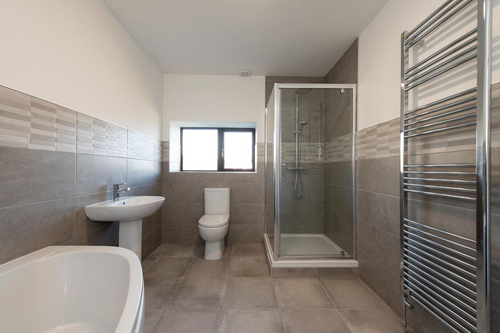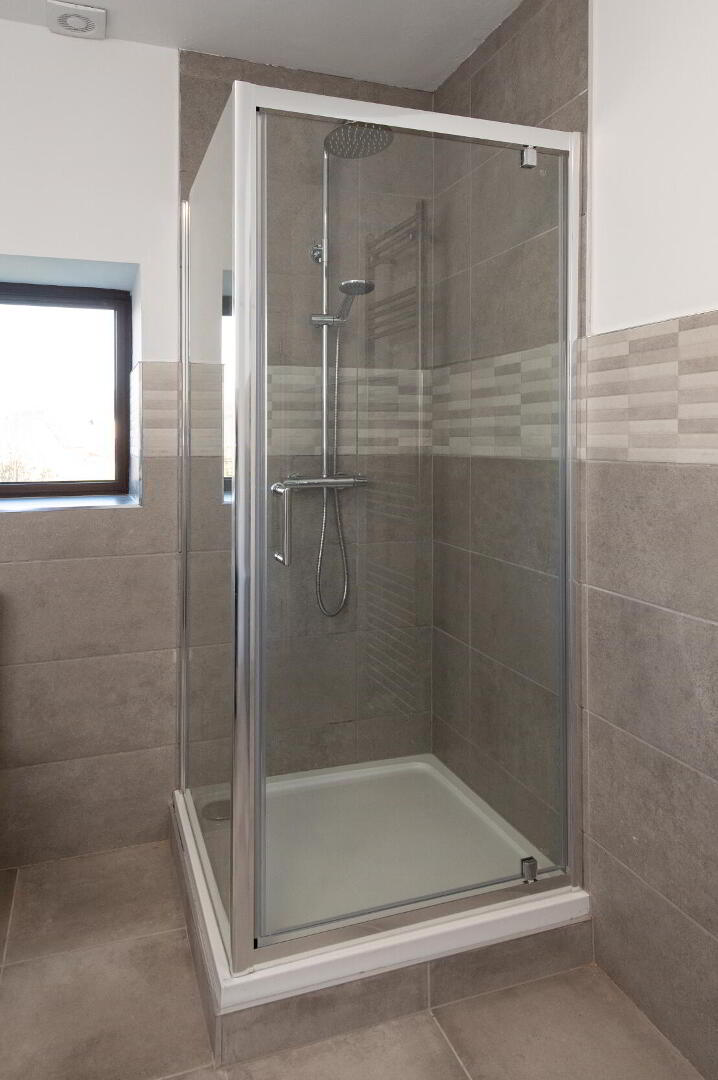 ENSUITE Low flush WC, pedestal wash hand basin, walk in shower unit with controlled rain shower, luxury ceramic tiled flooring, heated towel rail, extractor fan