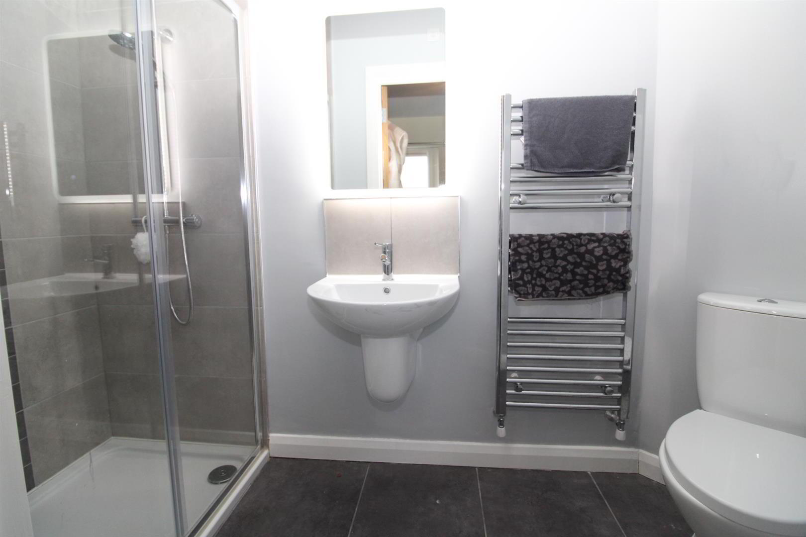 - Glazed shower cubicle with feature rainfall shower and separate hand held shower, half pedestal wash hand basin, low flush W/C, chrome heated towel rail, wall tiling, ceramic tiled flooring, LED mirror, extractor fan