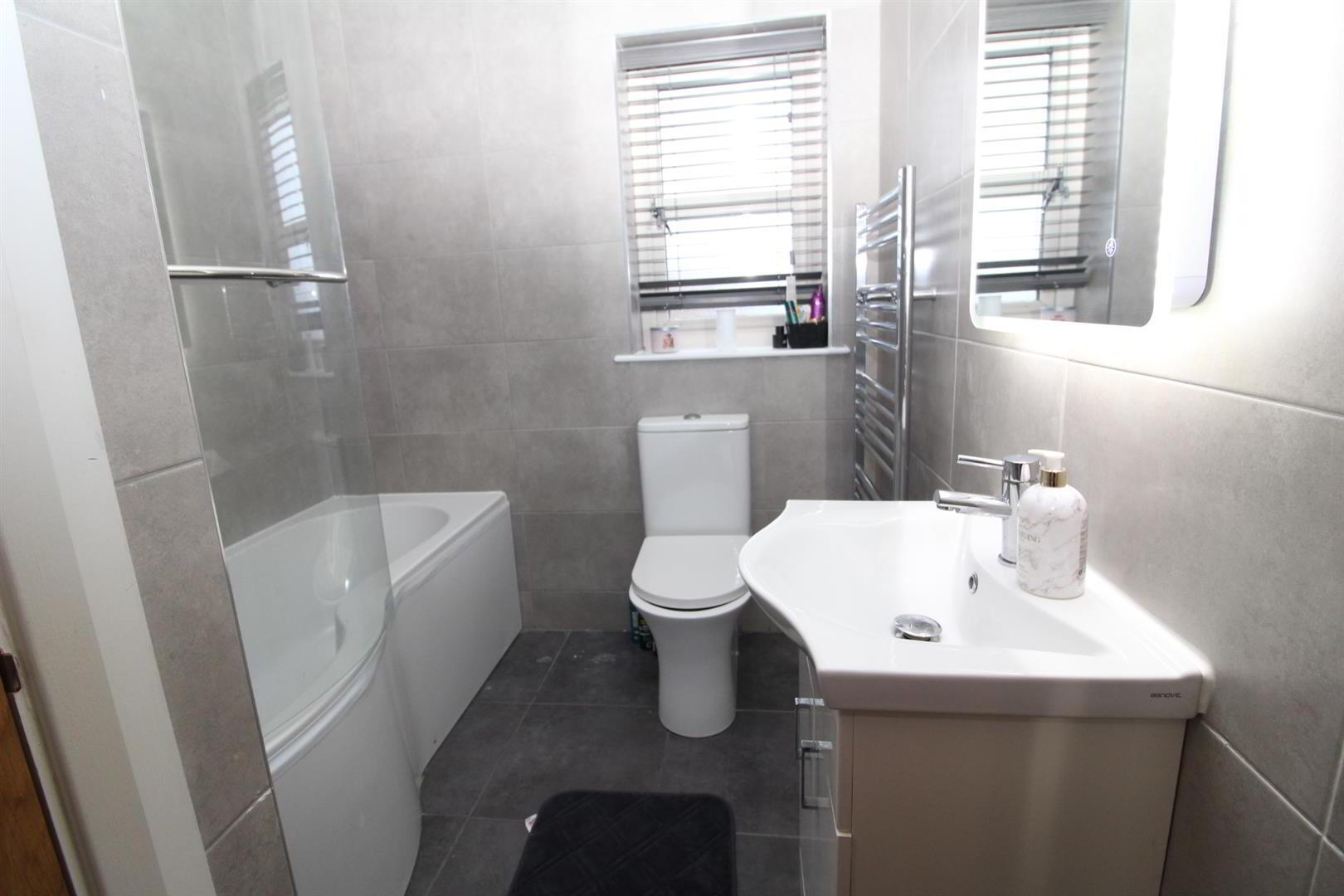 - White suite comprising panelled bath, glazed shower screen, feature rainfall shower and separate handheld shower, low flush W/C, vanity unit sink, wall tiling, ceramic tiled flooring, chrome heated towel rail, extractor fan, downlighters, built in storage