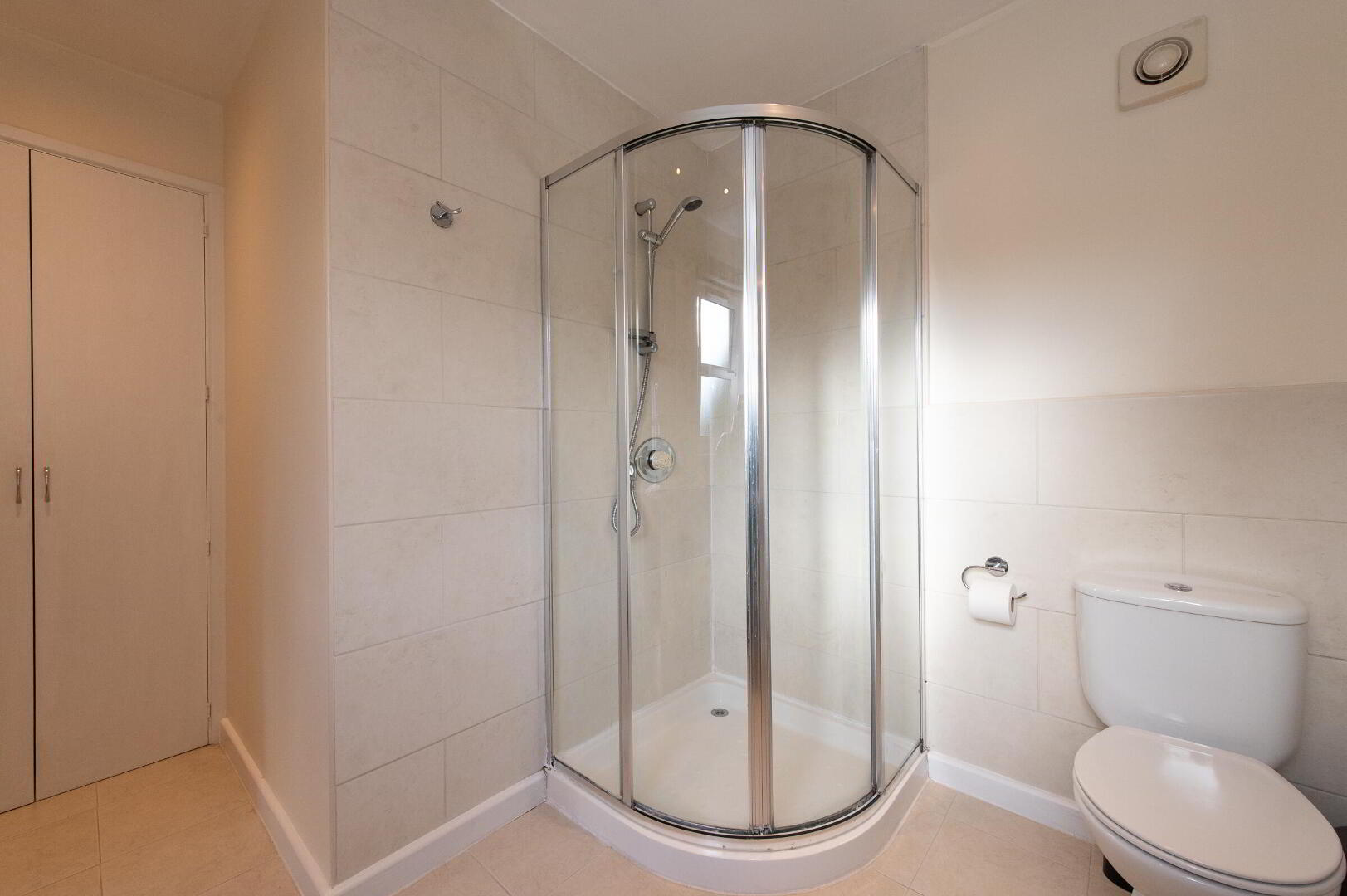 ENSUITE SHOWER ROOM Glazed shower cubicle with thermostatic controlled shower, W/C, pedestal wash hand basin, wall tiling, ceramic tiled flooring, downlighters, extractor fan, built in storage