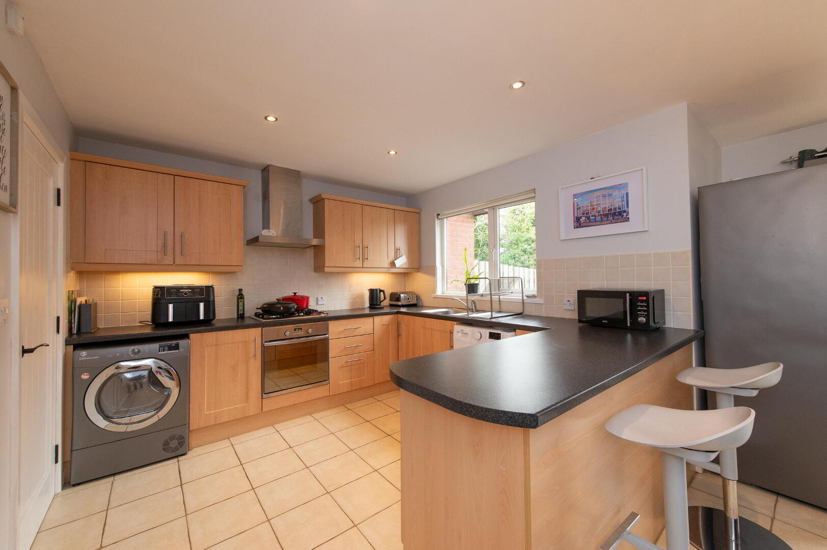 KITCHEN 19' 11" x 14' 6" (at max) or 10'4 (at min) (6.07m x 4.42m) Range of high and low level units, round edge worksurfaces, single drainer stainless steel sink unit with mixer tap, vegetable sink, spacious pantry storage, wall tiling, ceramic tiled flooring, plumbed for washing machine, built in stainless steel oven and gas hob unit, stainless steel extractor fan and canopy, downlighters, open plan casual dining area with patio doors to rear
