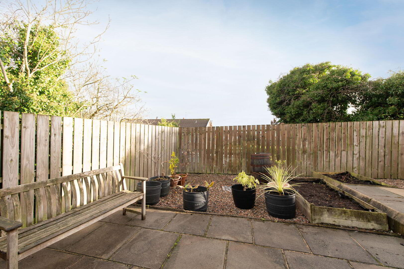 Enclosed paved garden to side and rear, area in stones, outside light and tap