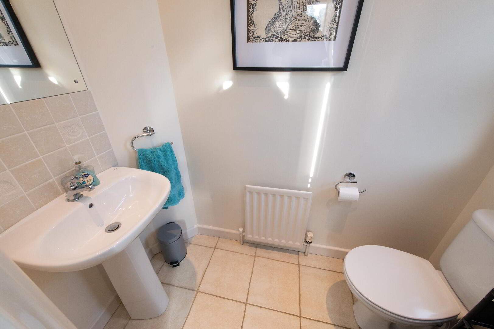 CLOAKS Low flush W/C, pedestal wash hand basin, wall tiling, ceramic tiled flooring, extractor fan, downlighters