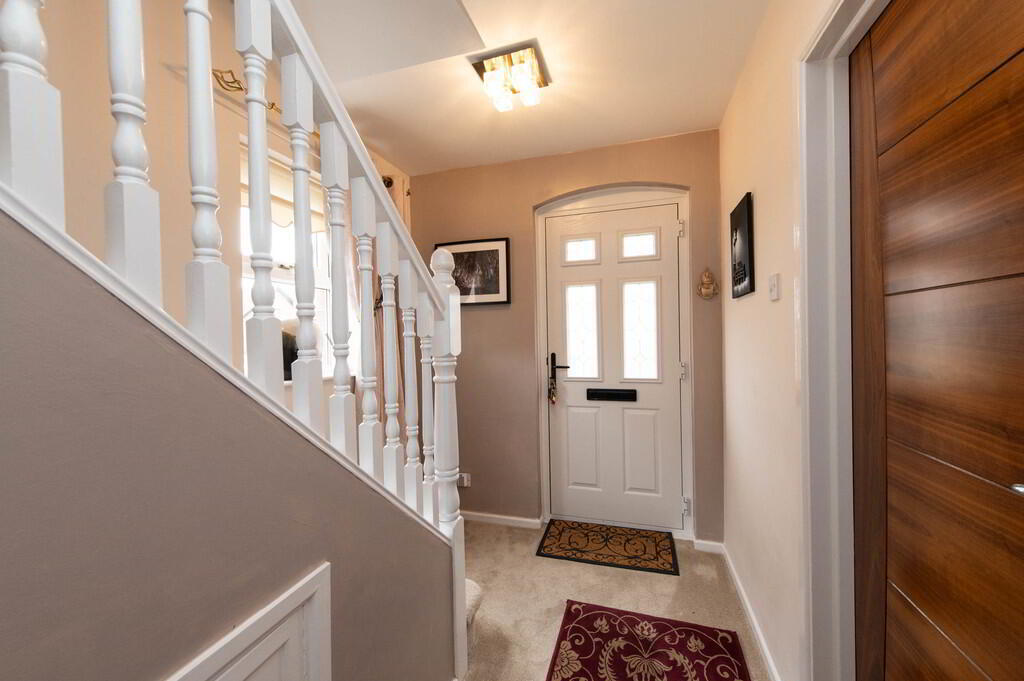 ENTRANCE HALL Understairs storage cupboard with gas boiler, PVC front door, cornicing, laminate wooden flooring, plumbed for toilet/ sink