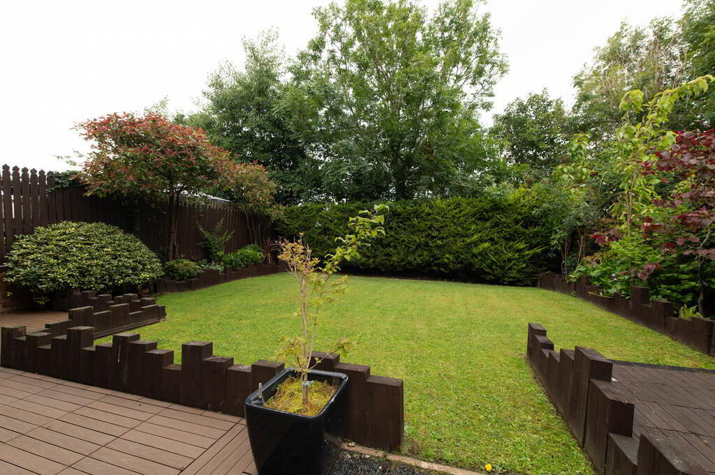 Rear: In lawn, composite decking, hedges, plants, trees and shrubs, shed, tarmacked, outside tap, outside light, uPVC fascia and rainwater goods