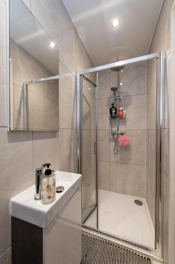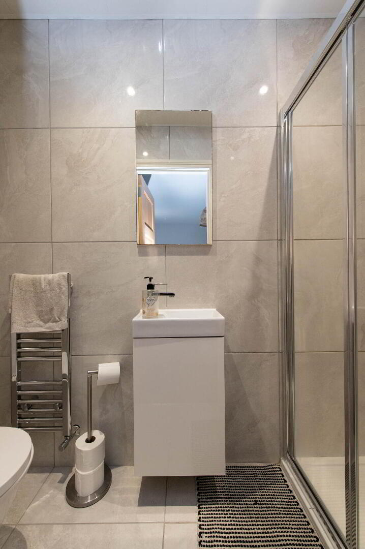 ENSUITE SHOWER ROOM Glazed shower cubicle with folding doors, feature rainfall shower and separate handheld shower, vanity unit sink, low flush W/C, polished porcelain wall and floor tiling, chrome heated towel rail