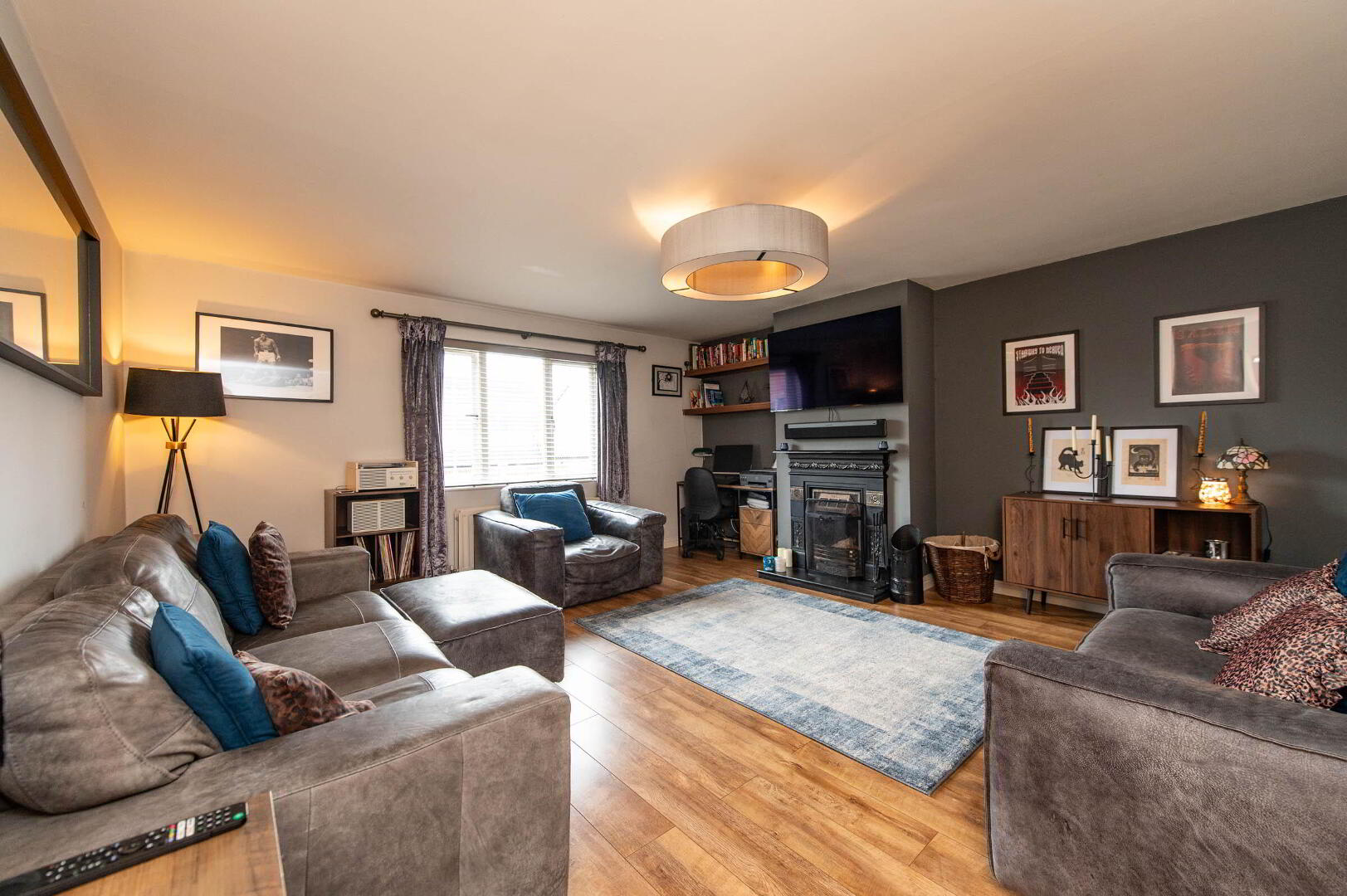 LOUNGE 16' 11" x 15' 6" (5.16m x 4.72m) Laminate wood flooring, feature cast iron fireplace, open fire, double doors to:
