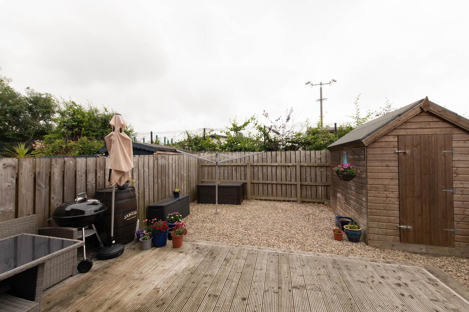 Rear: enclosed garden to rear in raised decked patio area and stones, outside light and tap