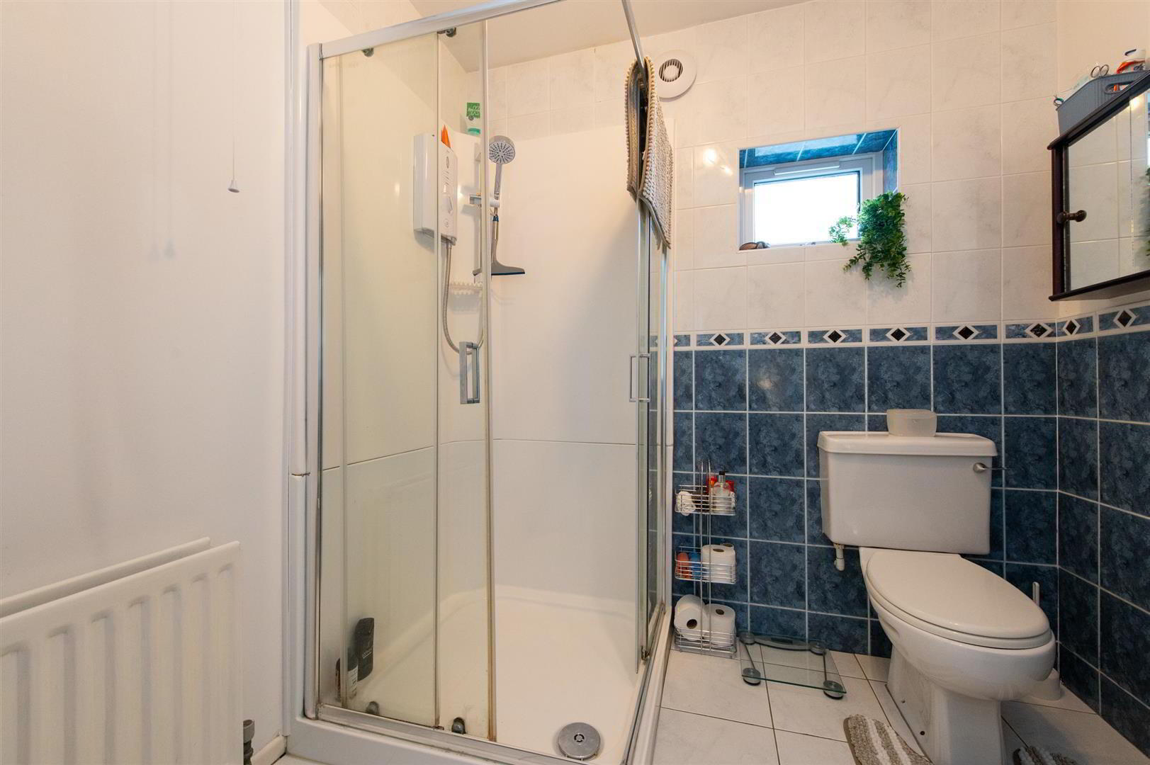 Shower unit with electric shower. Low flush WC. Pedestal wash hand basin. Wall mirror. Extractor fan. Wall tiling. Ceramic tiled flooring.