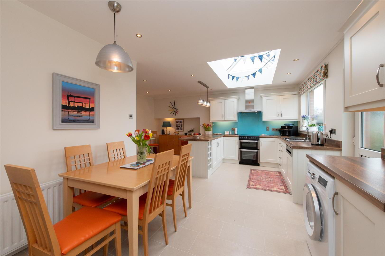 At widest points. 10' 9" x 10' 8" (3.28m x 3.25m) at narrow points: Range of built in high and low level units. Round edge work surfaces. Breakfast bar. Integrated wine rack. Single drainer Franke stainless steel sink unit with mixer tap. Integrated dishwasher and fridge freezer. Plumbed for automatic washing machine. Stainless steel extractor fan. Custom fitted glass splash back. Concealed lighting. Downlighters and feature pendant lights. Roof lantern. Karndean flooring. Open plan to:
