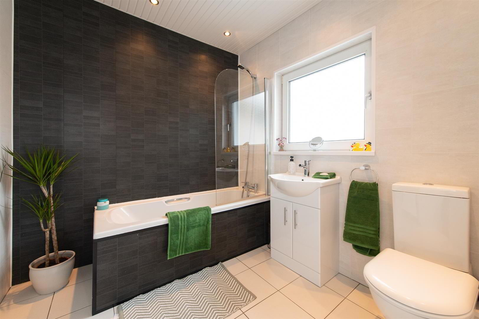 White suite. Panelled bath with overhead shower. Vanity unit. PVC wall panelling. PVC ceiling. Wall mirror. Downlighters. Ceramic tiled flooring. Access to floored roof space with overhead lighting.