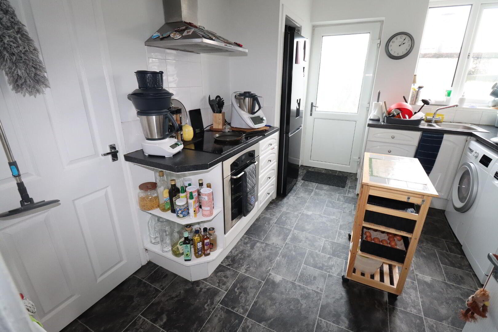 KITCHEN 11' 5" x 9' 10" (3.48m x 3m) Range of high and low level units, round edge work surfaces, single drainer stainless steel sink unit with mixer taps and vegetable sink, plumbed for washing machine, built in oven, inlaid hob, space for fridge freezer