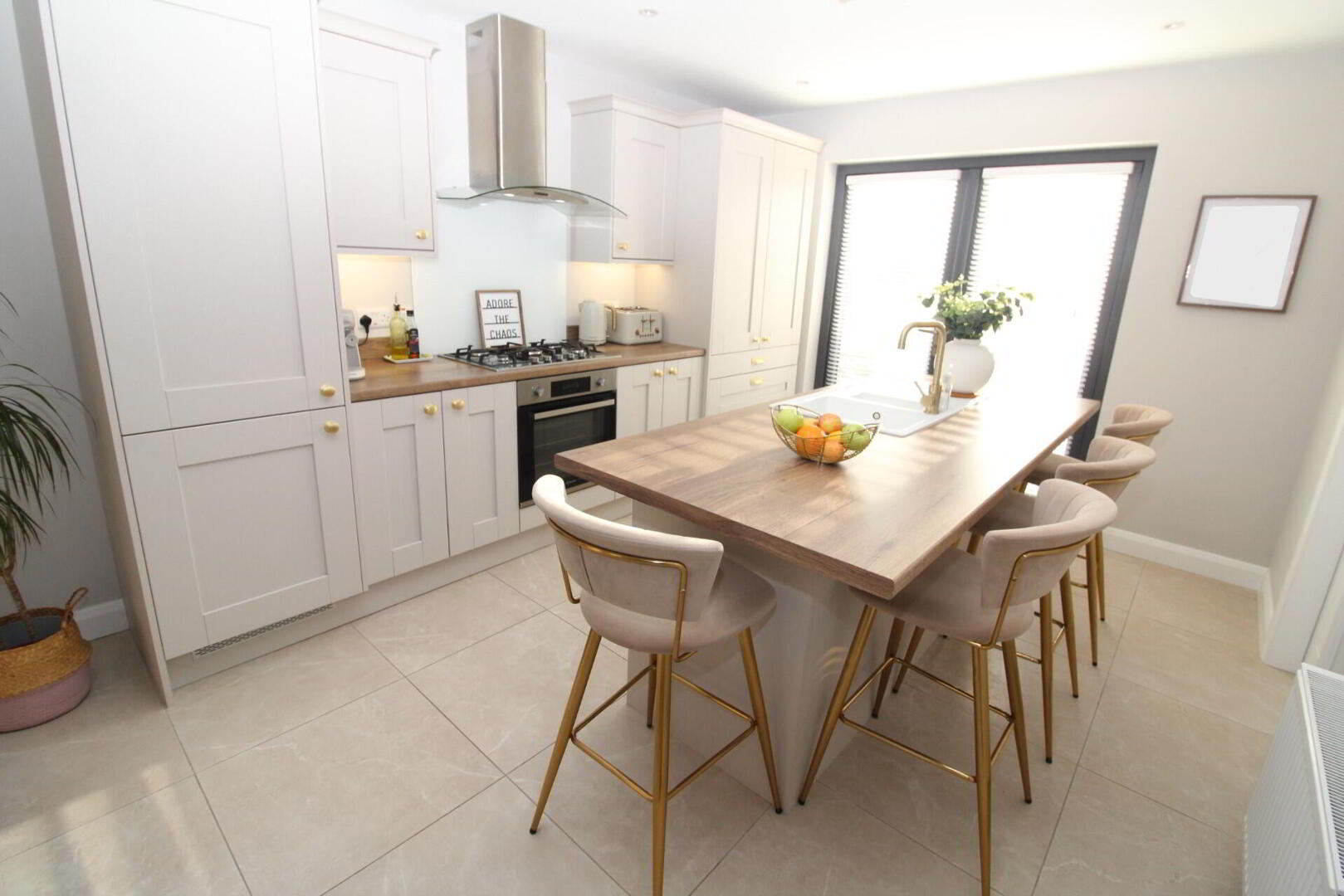KITCHEN/ DINING 21' 1" x 21' 10" (6.43m x 6.65m) Modern fitted kitchen with shaker style units, contrasting round edge worksurfaces, built in fridge freezer, built in dishwasher, built in oven with gas hob 5 ring, composite 1/2 door, sink unit with gold mixer tap and drainer, stainless steel extractor fan, island unit with benched seating area, canopy, French doors to rear garden, ceramic tiled flooring