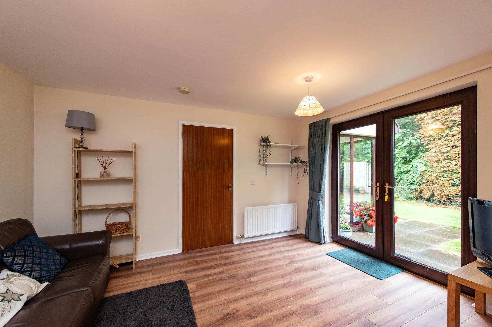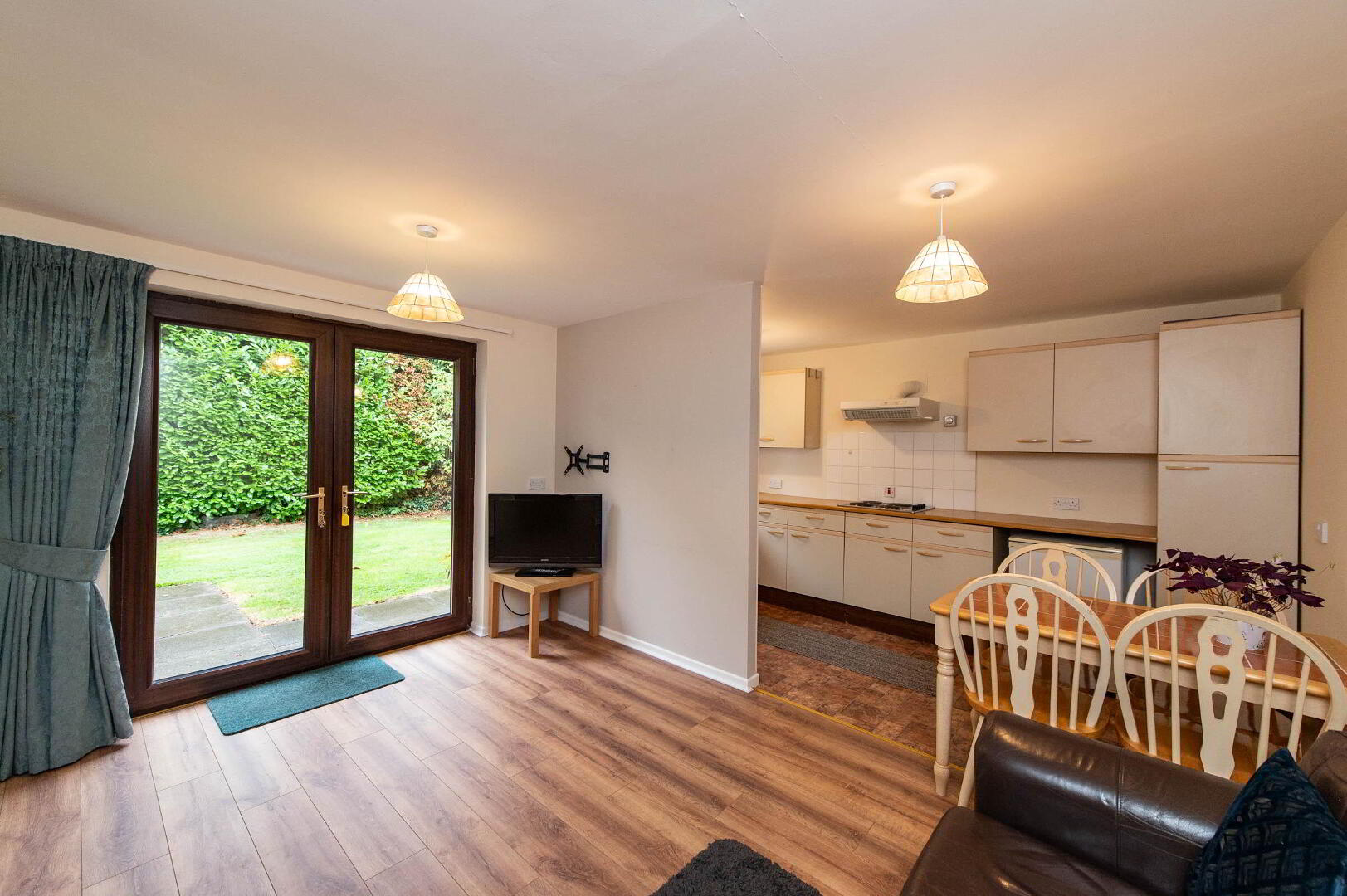 Casual lounge/ dining area, laminate wood flooring, built in cupboards, French doors to garden