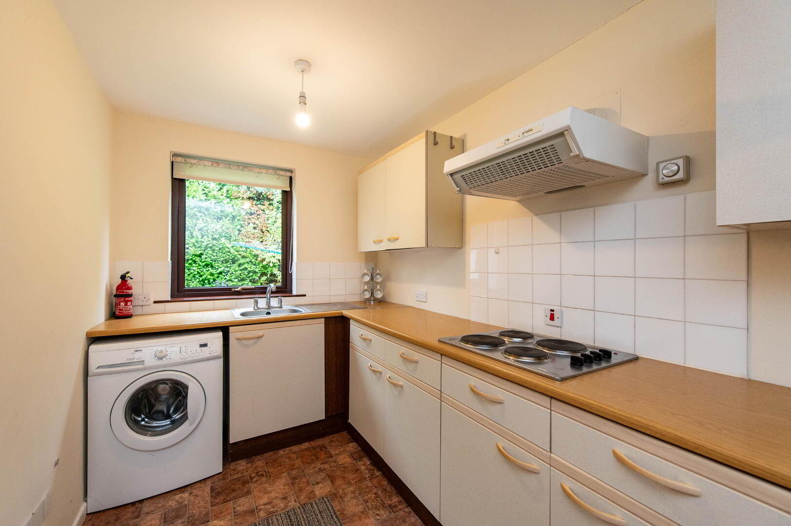 Rear in lawn, mature plants and shrubs, store with gas boiler