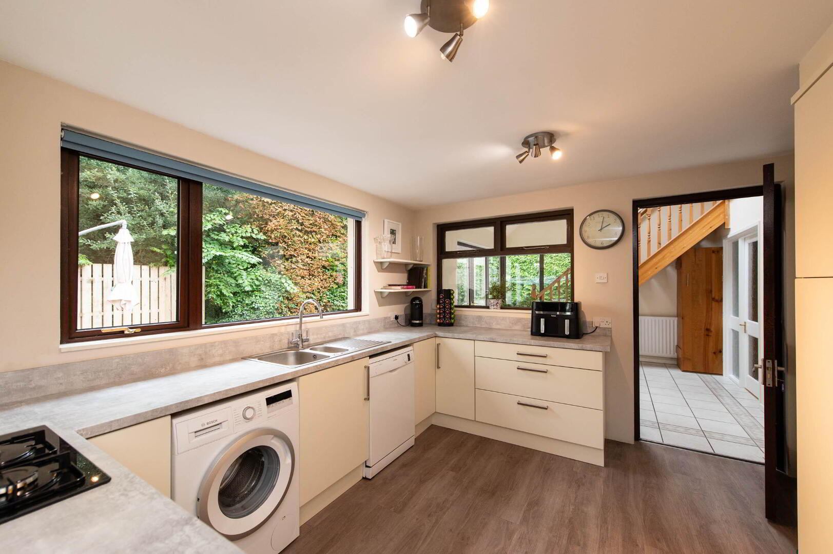 KITCHEN 11' 11" x 10' 10" (3.63m x 3.3m) Modern fitted kitchen with range of high and low level units, round edge worksurfaces, stainless steel sink unit with mixer tap, plumbed for dishwasher, plumbed for washing machine, built in gas hob, built in double oven, space for fridge freezer, laminate wood flooring, access to Annex