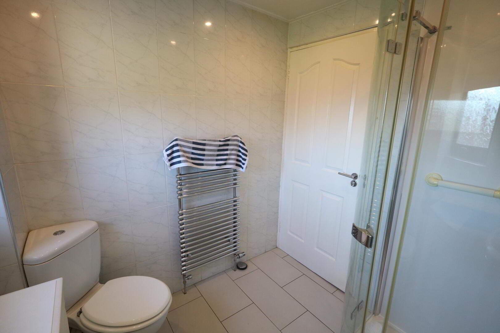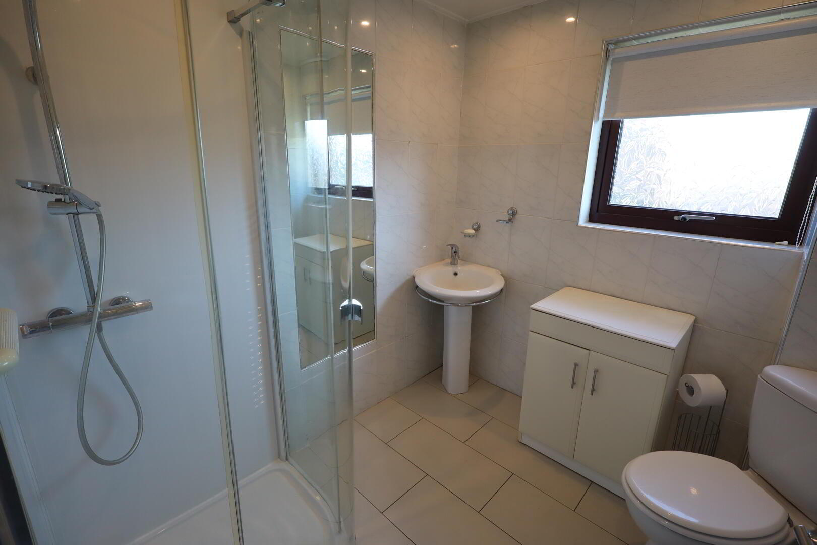 Three piece shower room comprising shower enclosure with thermostatically controlled shower unit and rainfall shower head, push button WC, pedestal wash hand basin with mixer tap, chrome heated towel rail, wall tiling, ceramic tiled flooring, downlighters.