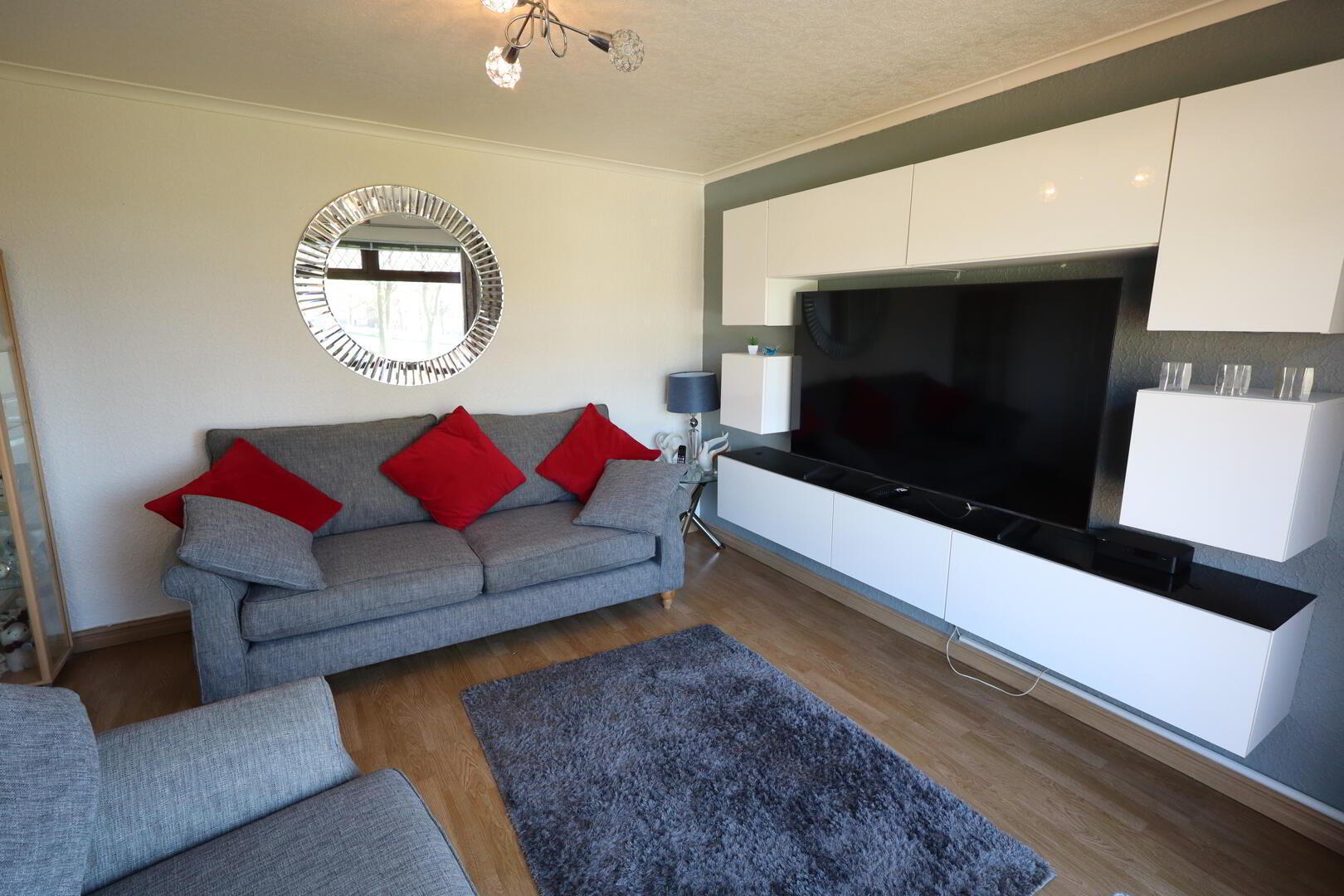 Built in media wall, ceiling cornice, wood laminate flooring.