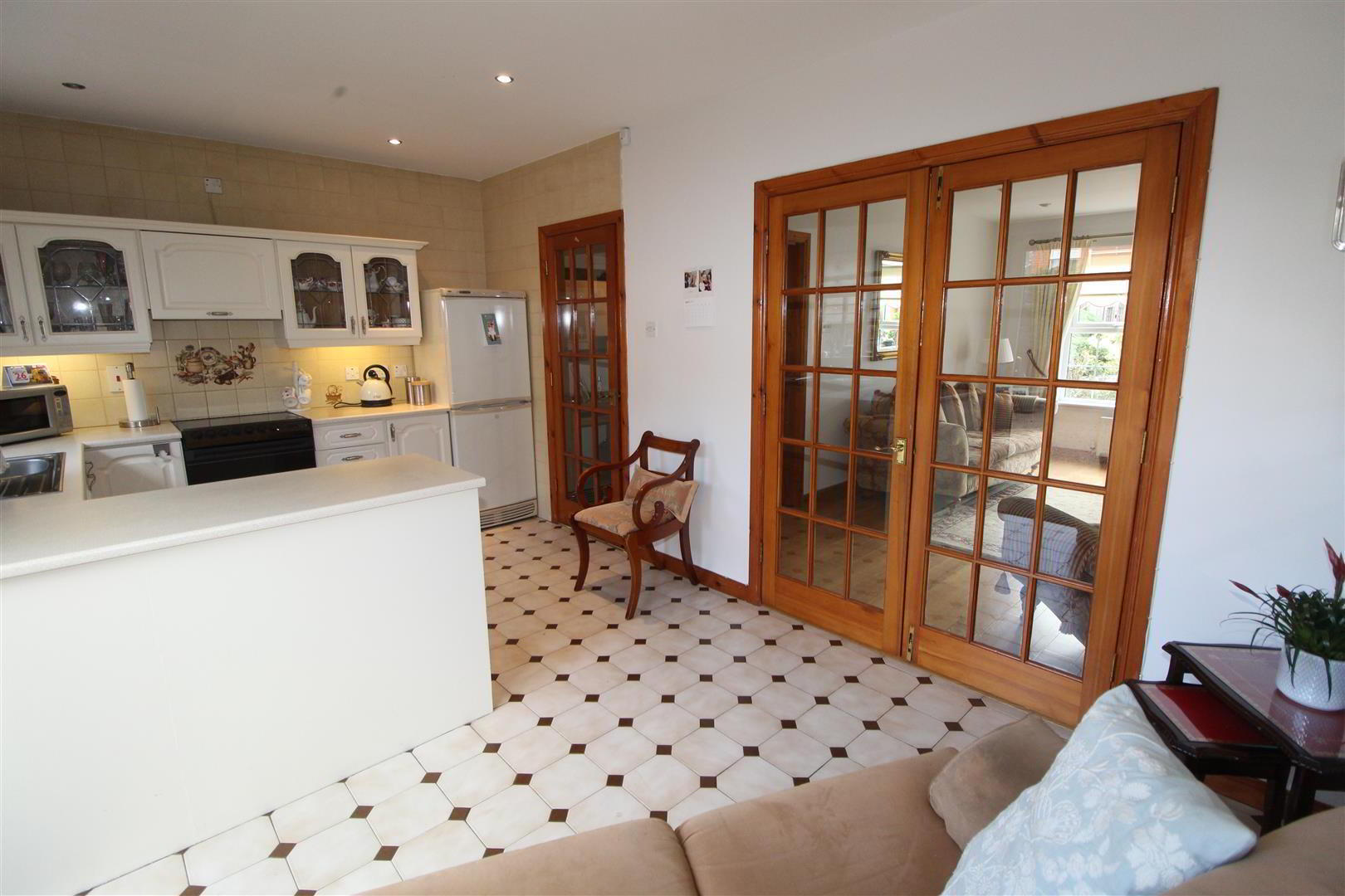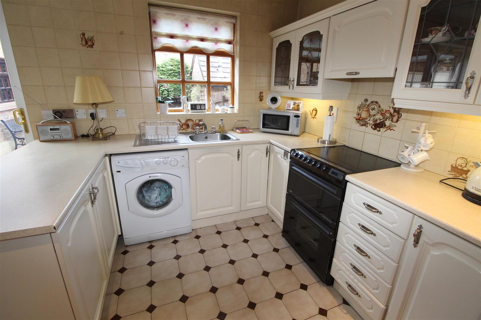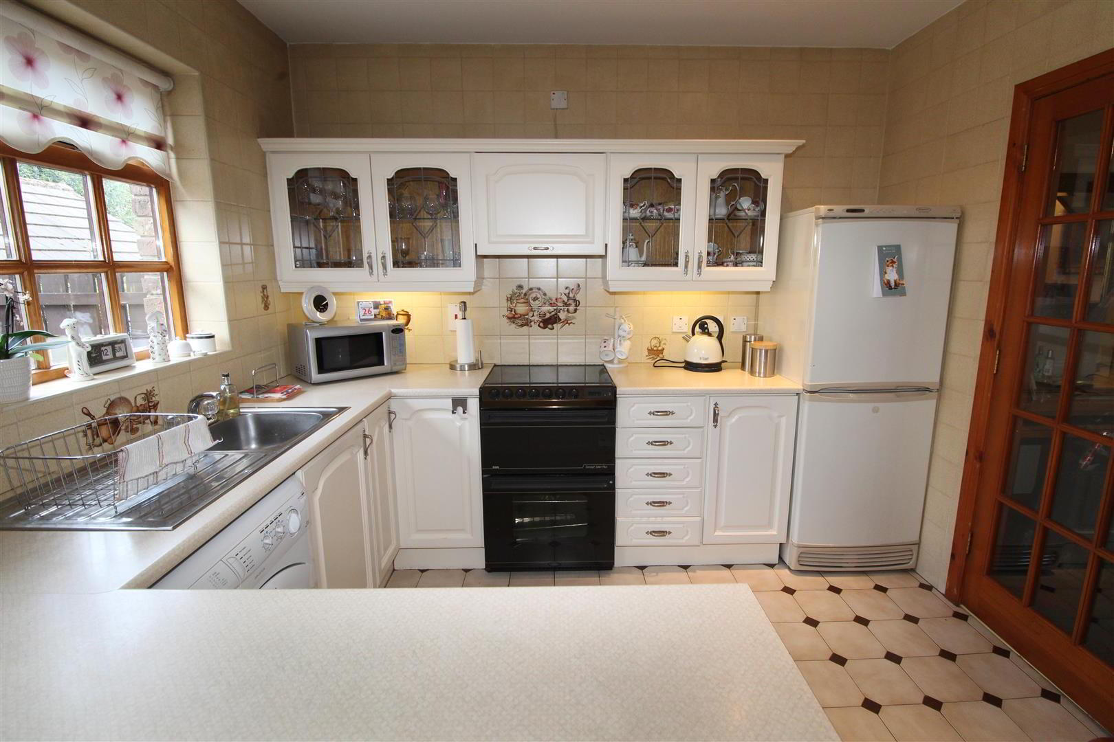 - Range of built in units, round edge worksurfaces, single drainer stainless steel sink unit with mixer tap, display units, plumbed for washing machine, ceramic tiled flooring, double glazed patio doors, ceramic tiled flooring, downlighters