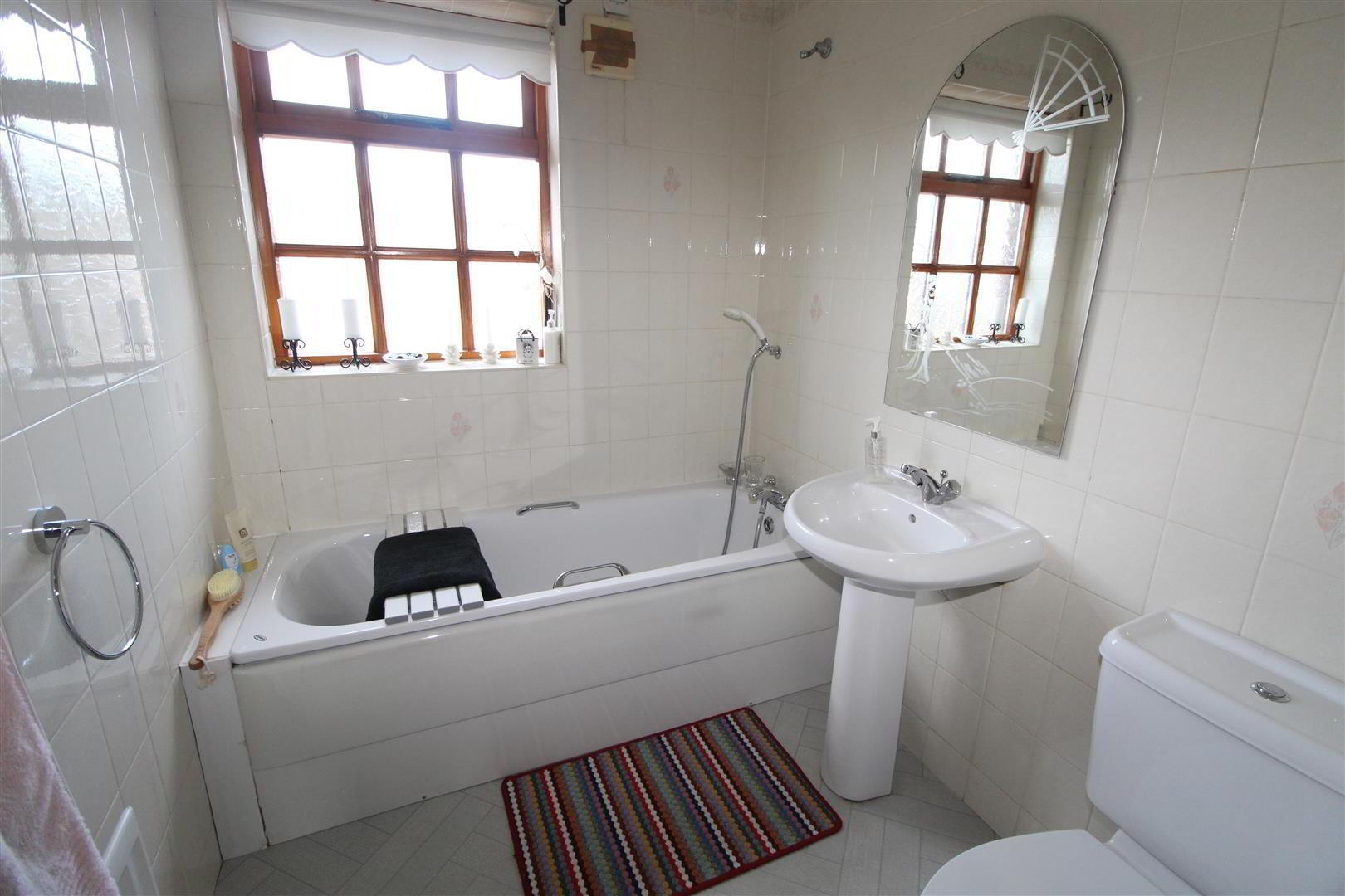 - White suite panelled bath with mixer tap, telephone hand shower, low flush W/C, pedestal wash hand basin, fully tiled walls