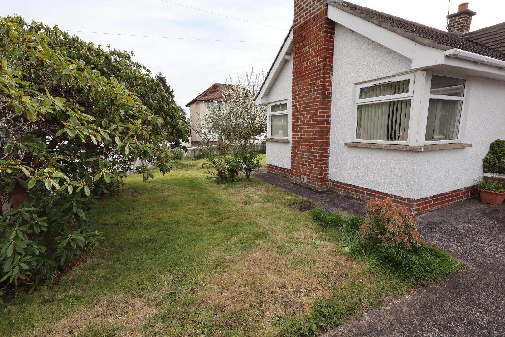 OUTSIDE Front: Laid in lawn. Car parking space.