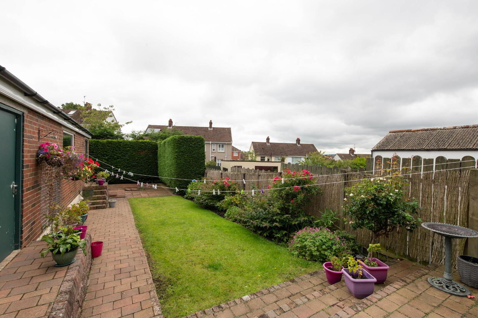 Rear in neat lawn, paved patio area, uPVC fascia and rainwater goods, outside light and tap