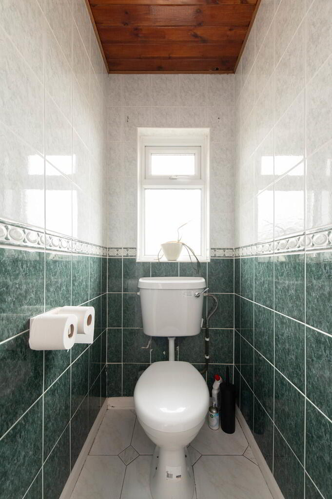 SEPARATE W/C Low flush W/C, fully tiled walls, ceramic tiled flooring, pine panelled ceiling