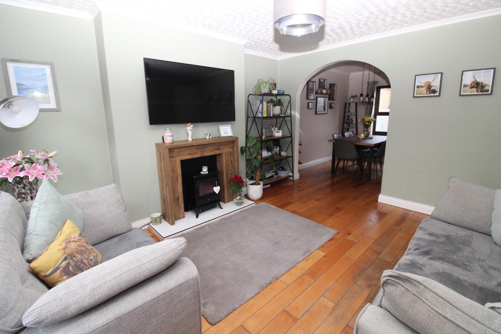 LOUNGE 13' 11" x 12' 5" (4.24m x 3.78m) Solid wood flooring, feature fireplace, tiled hearth, understairs storage, archway to:
