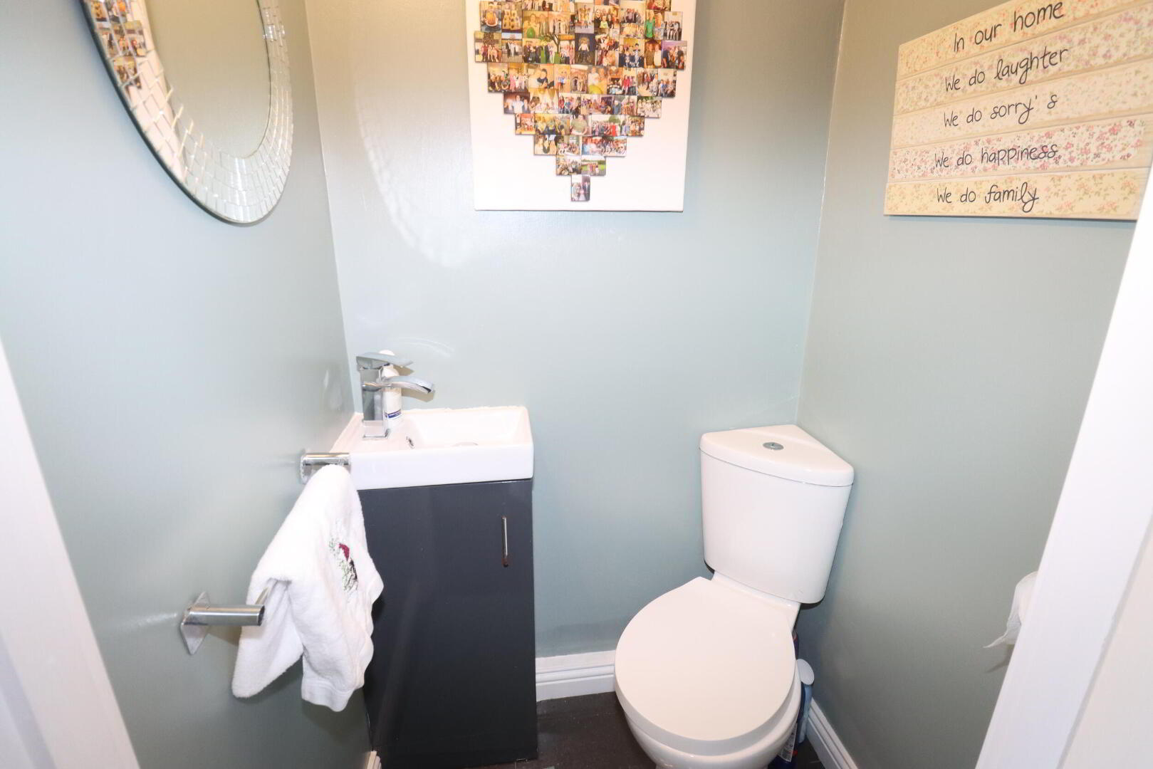 DOWNSTAIRS W/C Low flush W/C, wash hand basin, ceramic tiled flooring