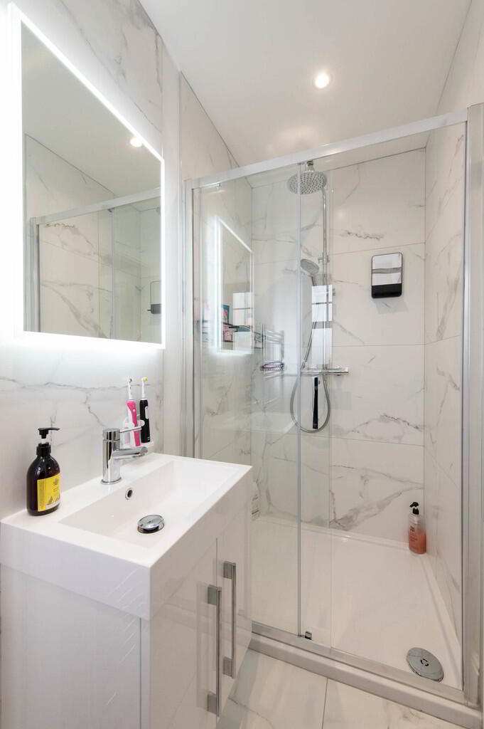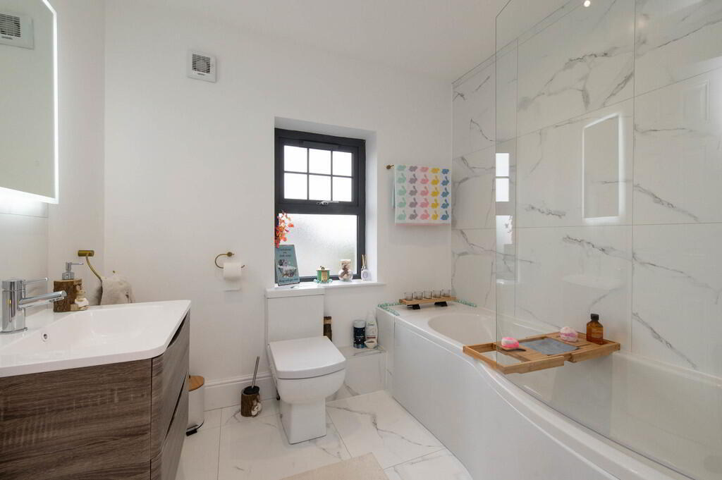 BATHROOM Modern white suite, panelled bath with mixer tap, shower with mixer tap, shower screen, wall tiling, vanity unit, low flush W/C, ceramic tiled flooring, extractor fan, downlighters