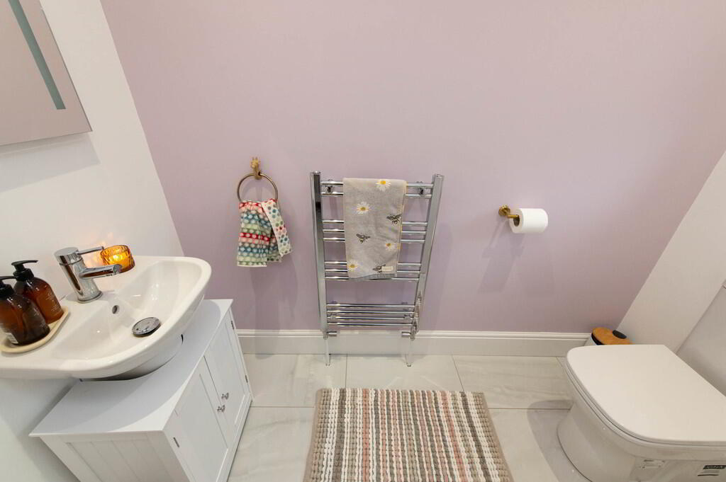 CLOAKS Low flush W/C, wash hand basin, heated towel rail, luxury floor tiling, extractor fan