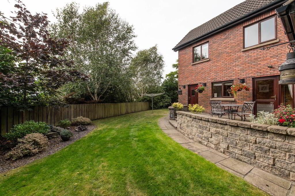 Rear in lawn, paved patio area, plants, trees and shrubs, water feature