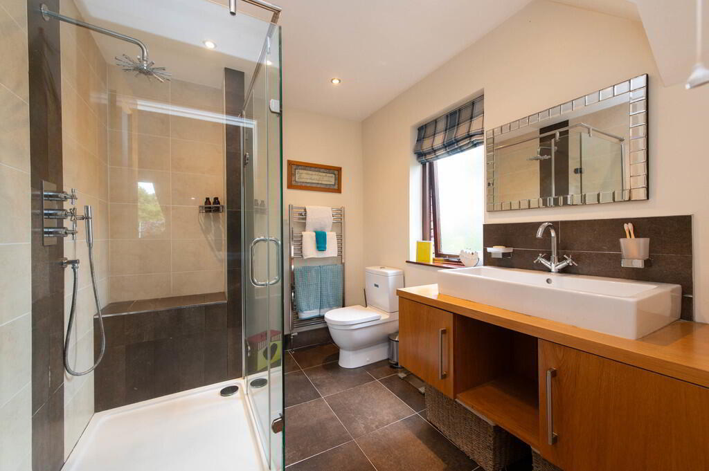 ENSUITE Low flush W/C, large shower unit with rain shower, large sink with mixer tap, heated towel rail, ceramic tiled flooring, downlighters
