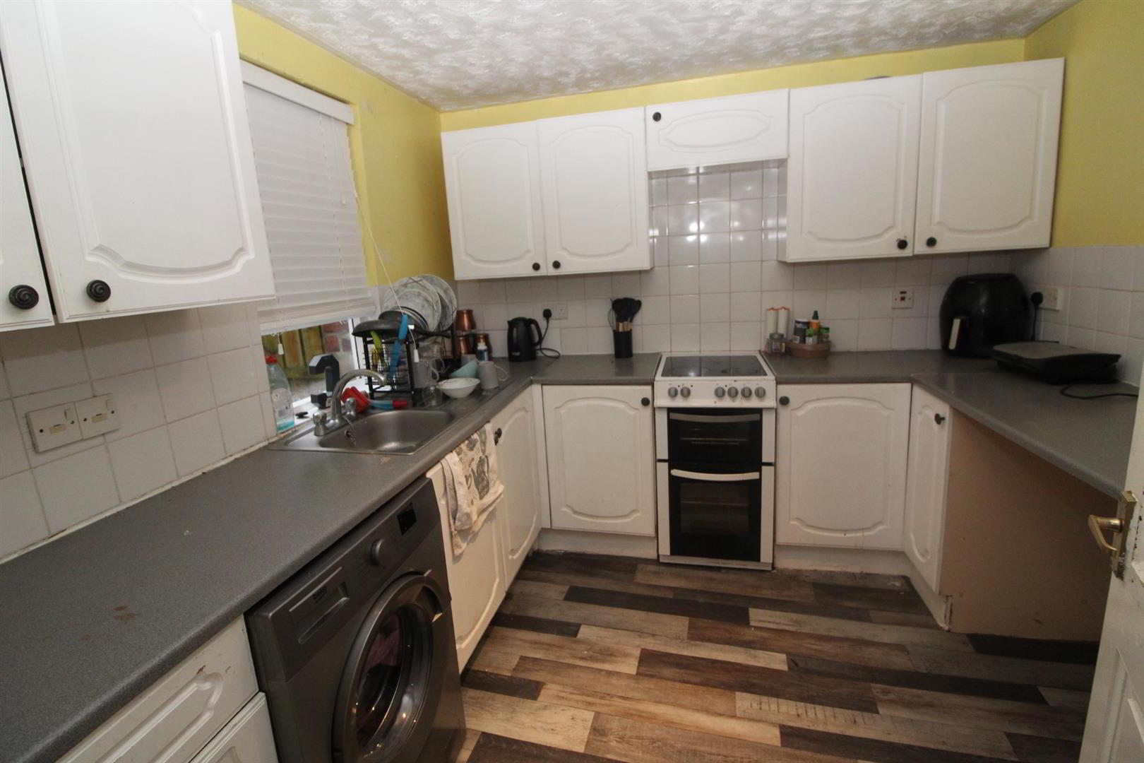 - Range of high and low level units, round edge worksurfaces, single drainer stainless steel sink unit with mixer tap, cooker point, plumbed for washing machine, wall tiling