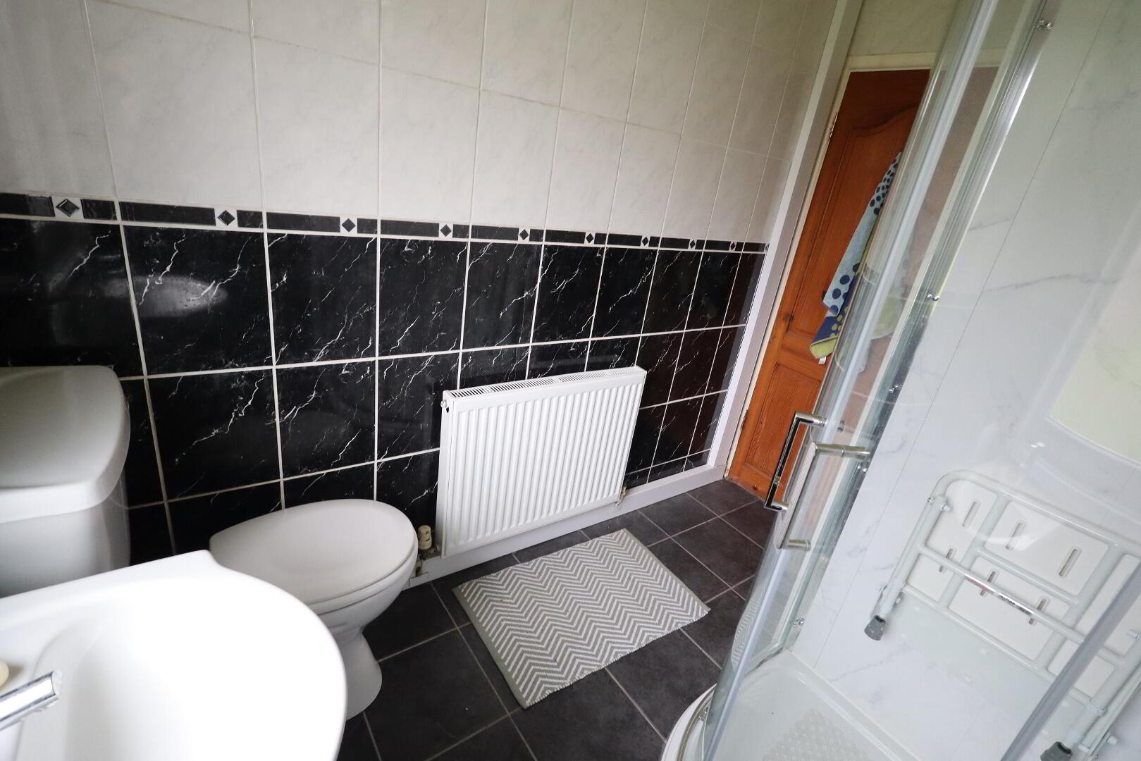 SHOWER ROOM Shower unit with thermostatically controlled shower, rainwater effect shower head, glazed shower screen, wall panelling, wall tiling, vanity sink unit, low flush W/C, extractor fan