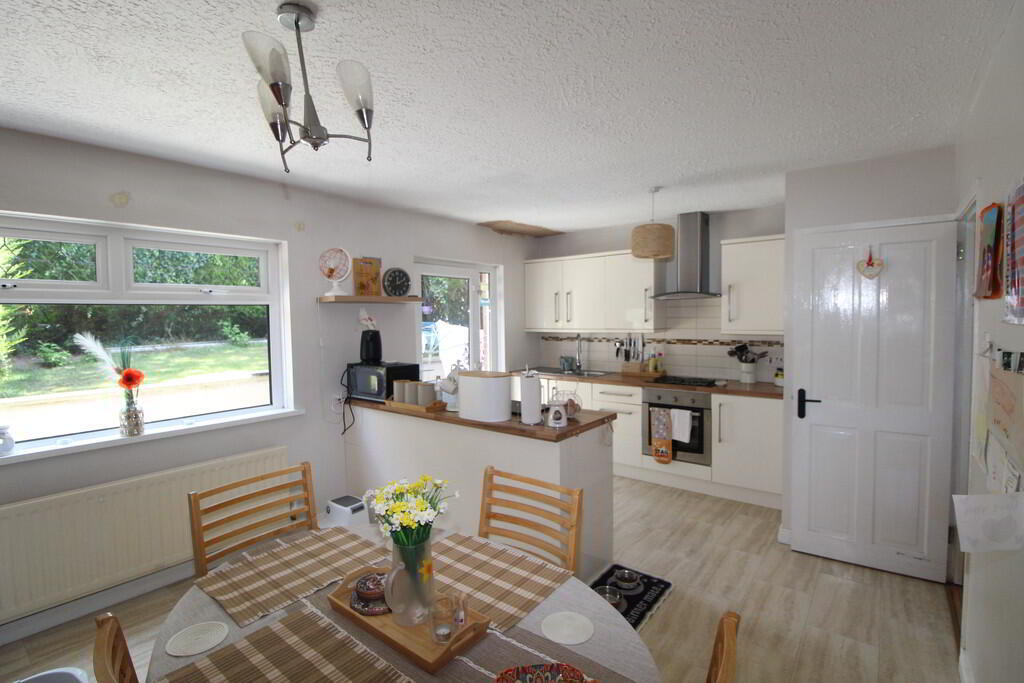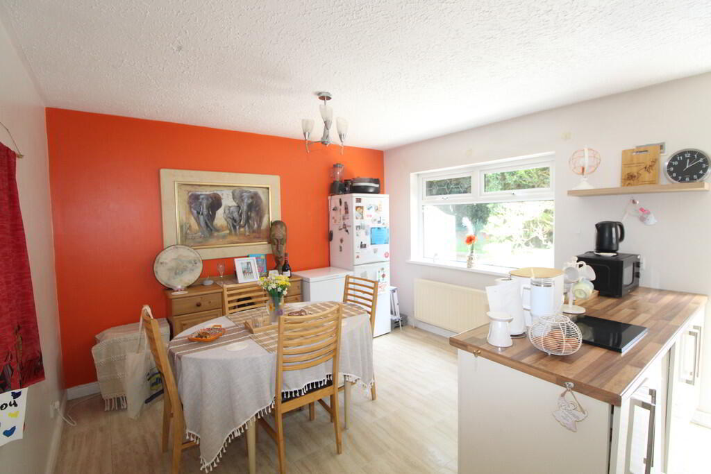 OPEN PLAN KITCHEN/ DINING 17' 2" x 11' 8" (5.23m x 3.56m) Range of built in high and low level units, round edge worksurfaces, single drainer stainless steel sink unit with mixer tap and vegetable sink, inlaid hob unit, under oven, breakfast bar, larder, laminate wood flooring, stainless steel extractor fan, fridge