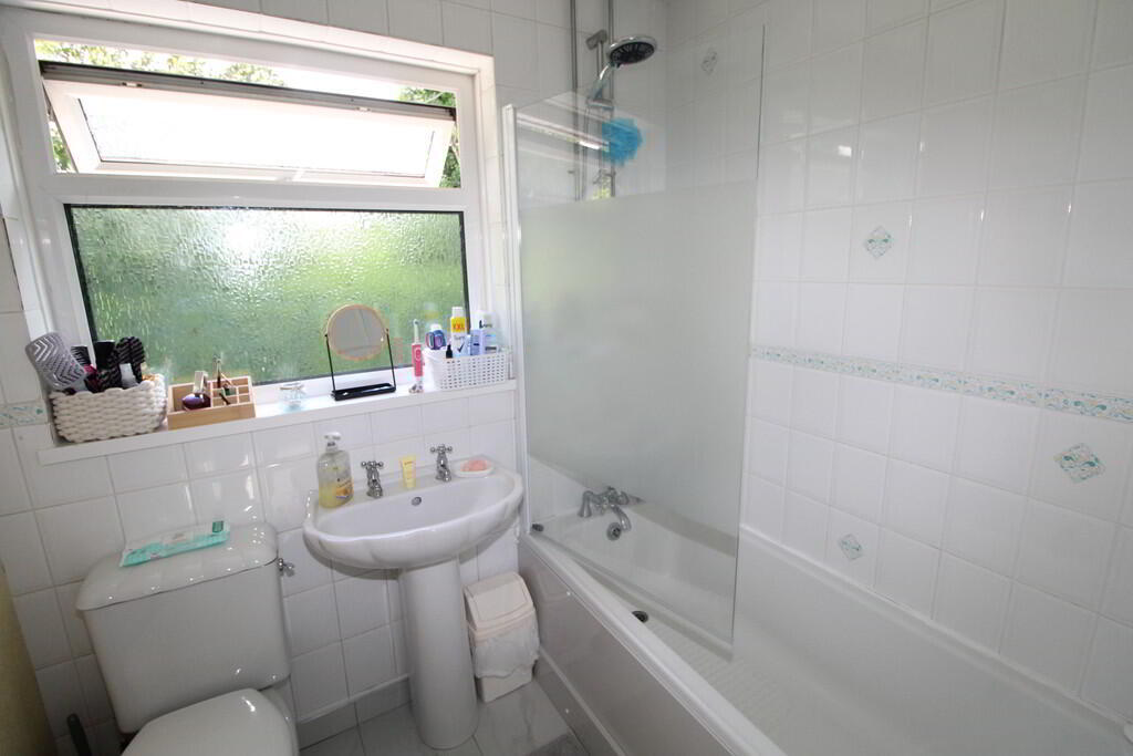 BATHROOM White suite, panelled bath with mixer tap, controlled shower, pedestal wash hand basin, low flush W/C, ceramic tiled flooring, wall tiling