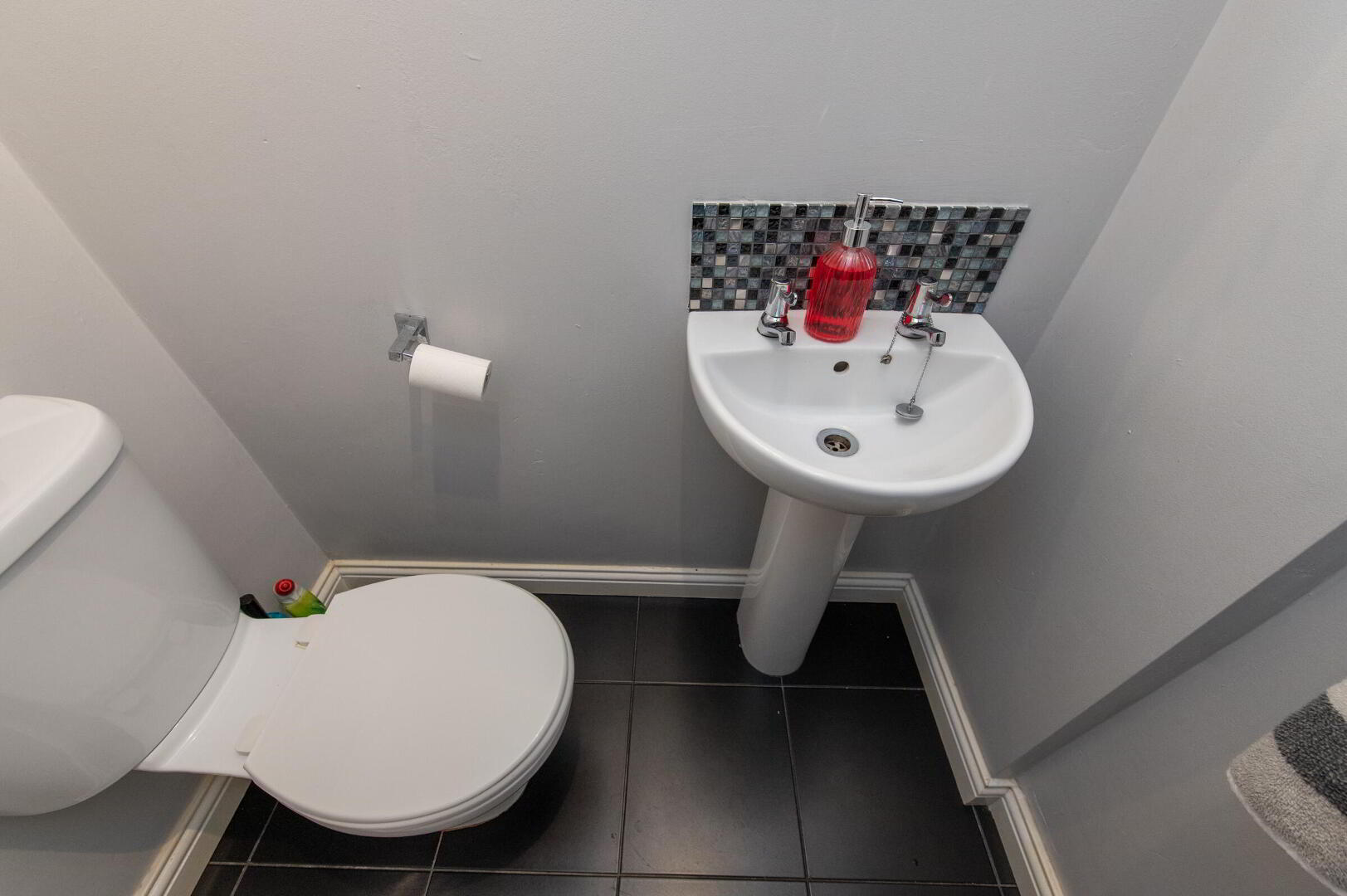 DOWNSTAIRS W/C Low flush W/C, pedestal wash hand basin, ceramic tiled flooring, alarm system, extractor fan
