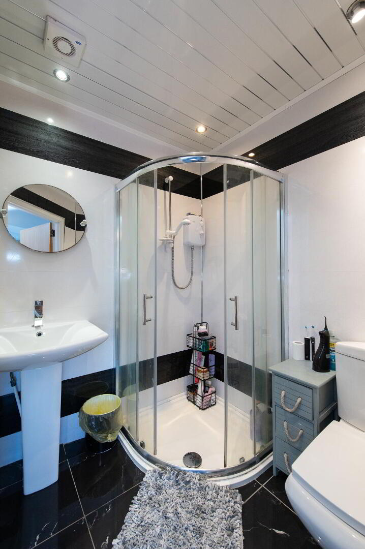 ENSUITE SHOWER ROOM Shower unit with electric shower, glazed shower screen, downlighters, panelled ceiling, ceramic tiled flooring, low flush W/C, pedestal wash hand basin, extractor fan