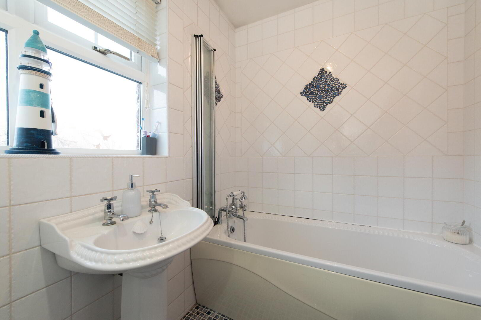 BATHROOM PVC bath unit, mixer taps, shower screen, low flush W/C, pedestal wash hand basin, wall tiling, ceramic tiled flooring