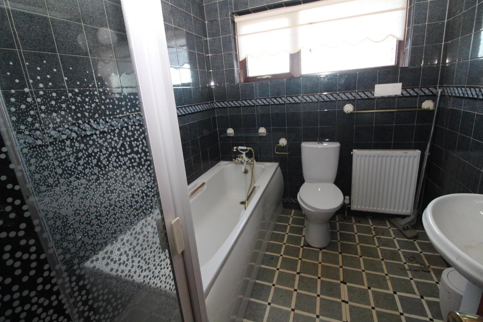 - White suite comprising panelled bath, telephone hand shower, low flush W/C, pedestal wash hand basin, glazed shower cubicle with Triton electric shower, wall tiling