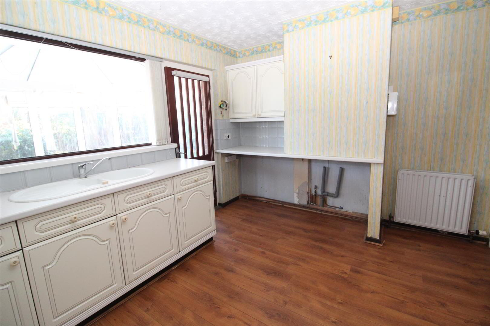 - Range of high and low level units, round edge worksurfaces, single drainer ceramic sink unit with mixer taps and vegetable sink, cooker point, hob unit, extractor fan, laminate wood flooring, wall tiling