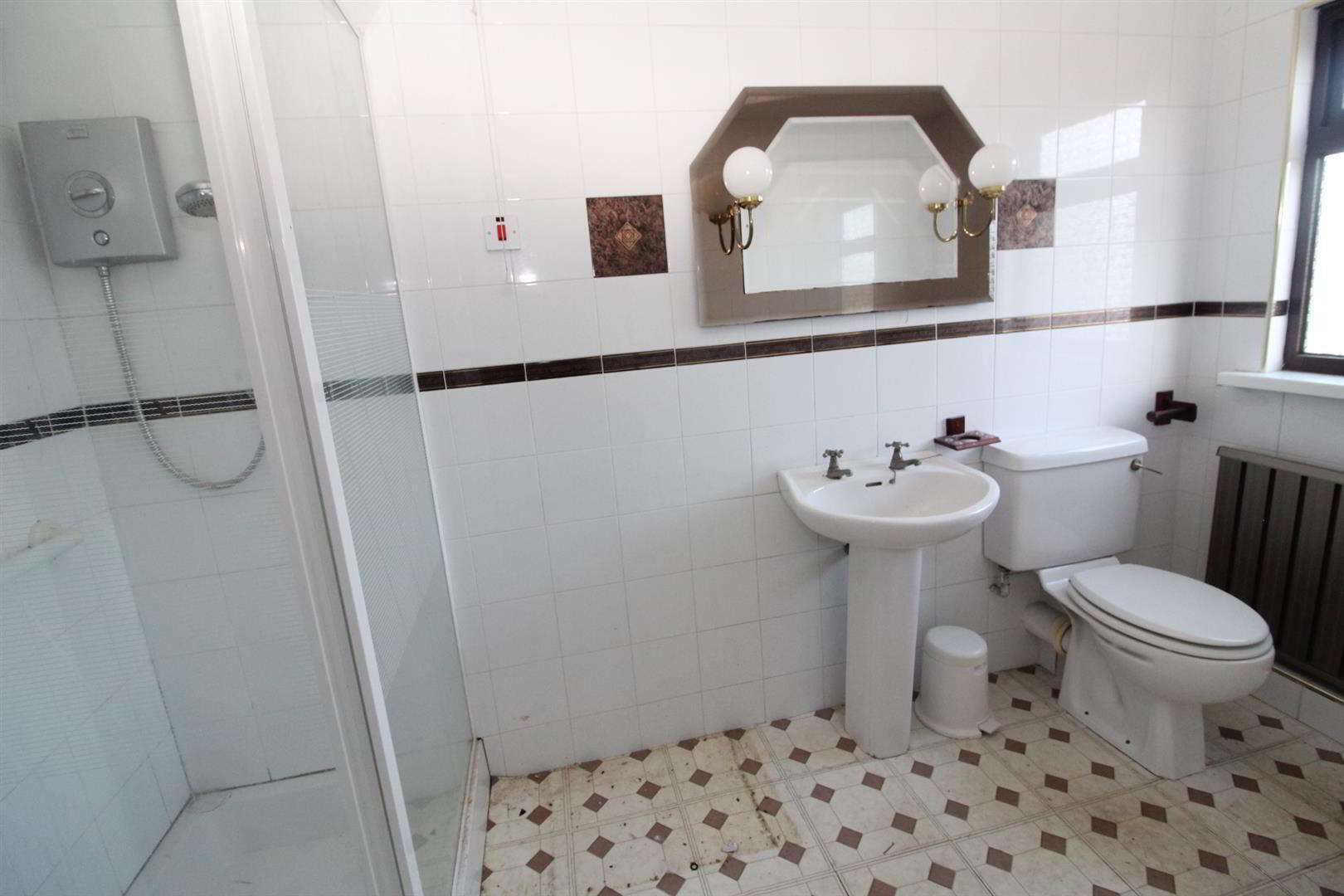 - Glazed shower cubicle, aqualisa showers, pedestal wash hand basin, low flush W/C, wall tiling