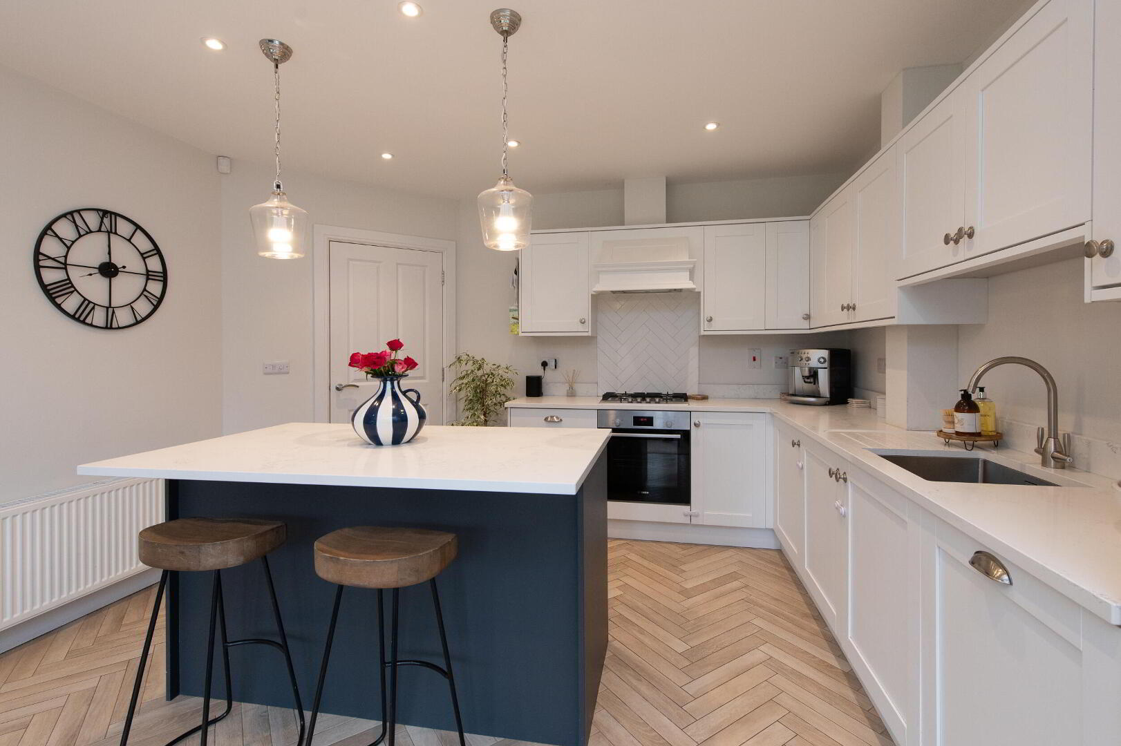 KITCHEN/ DINING ROOM 22' 6" x 13' 4" (6.86m x 4.06m) Modern fitted kitchen with range of high and low level units, worksurfaces, inlaid stainless steel sink unit with mixer tap and drainer, built in gas hob and built in fan assisted oven, extractor fan, built in fridge freezer, built in dishwasher, island with seating area.