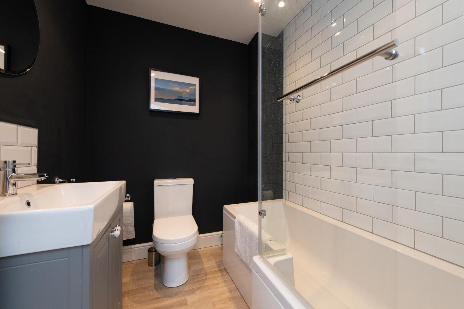 BATHROOM Luxury white bathroom suite, glazed shower screen, vanity unit, panelled bath with mixer tap, ceramic tiled flooring