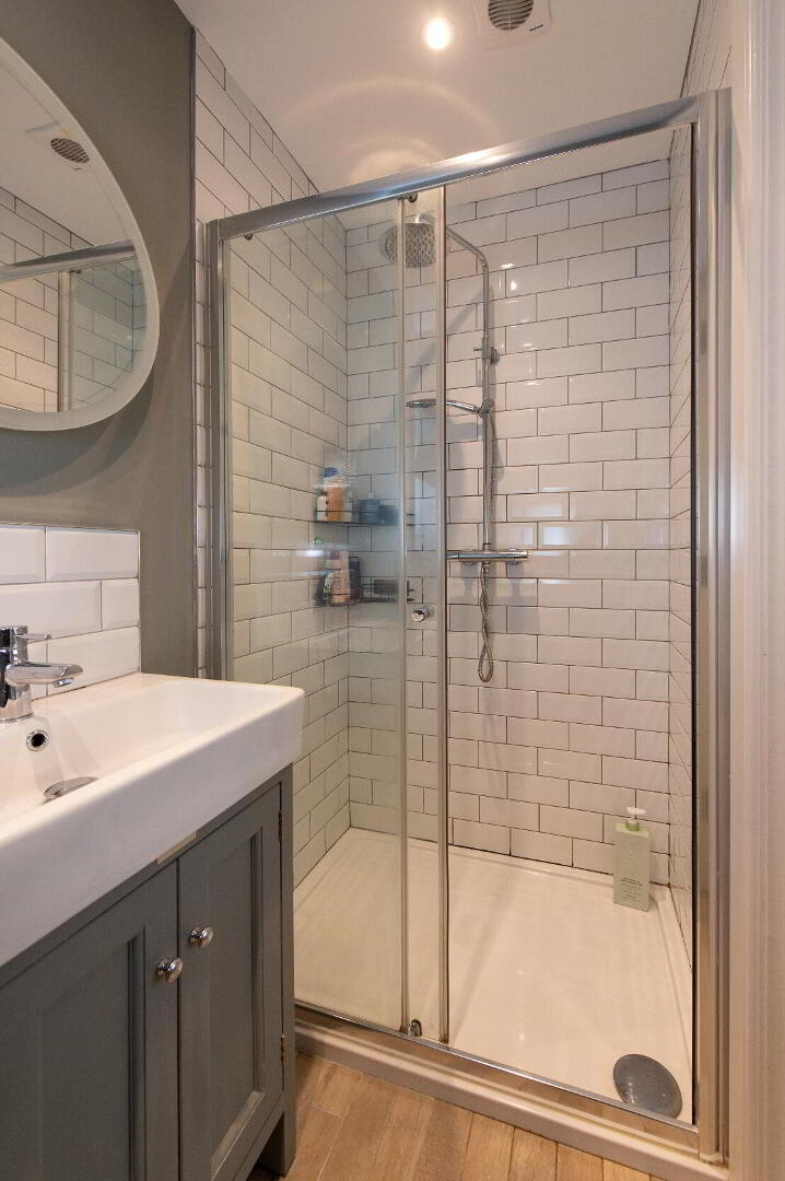 ENSUITE Low flush W/C, vanity unit with mixer tap, glazed shower unit with rain shower, tiling, ceramic tiled flooring