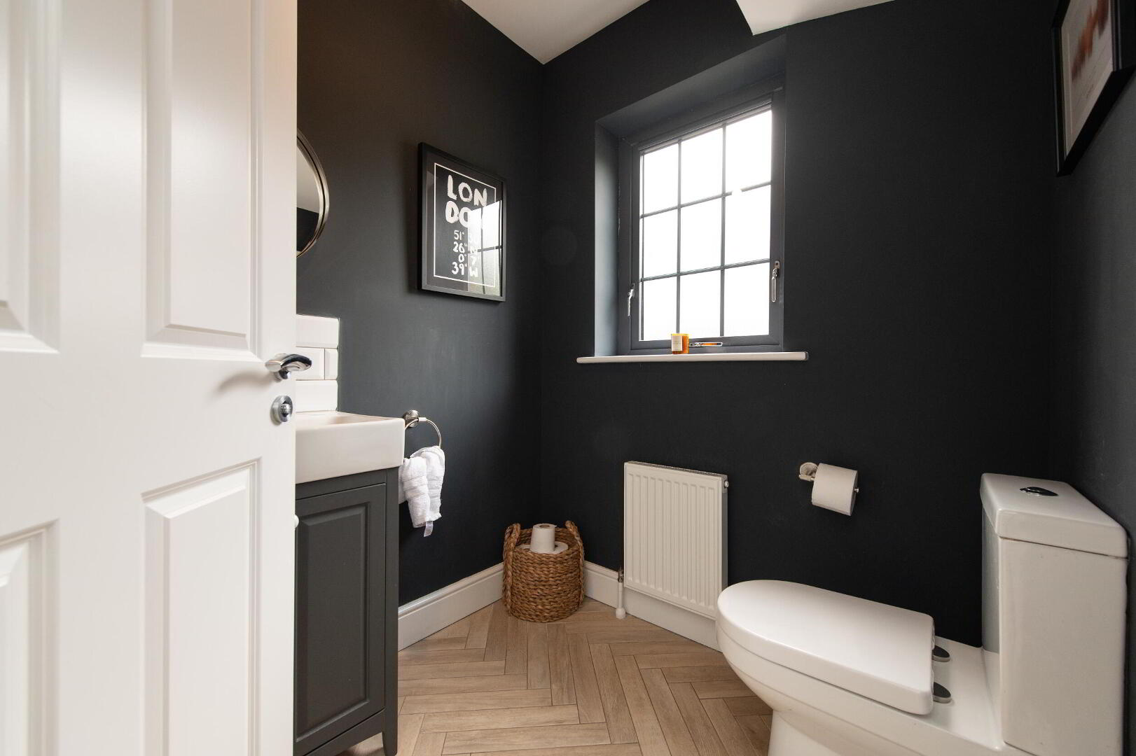 CLOAKS Low flush W/C, pedestal wash hand basin, ceramic tiled flooring, extractor fan, parquet tiled flooring